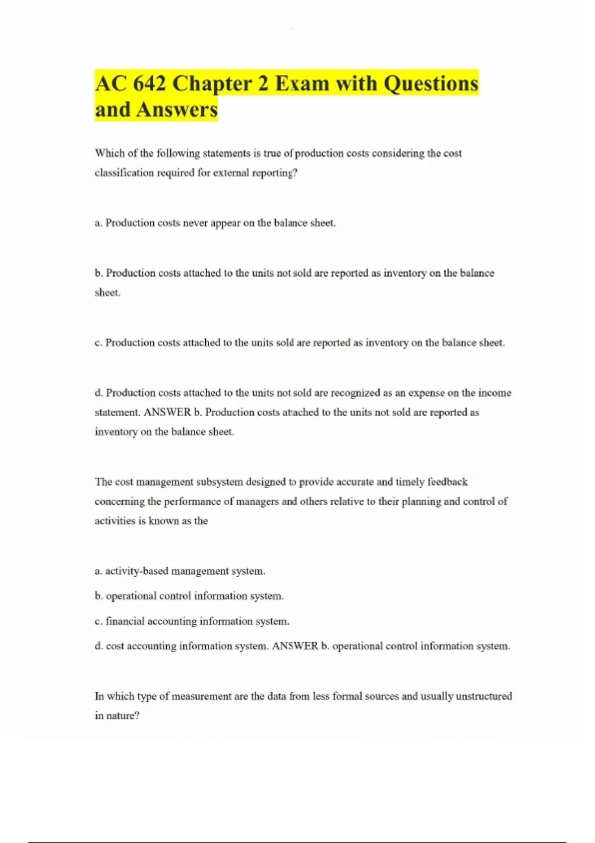 AC 642 Chapter 2 Exam with Questions and Answers Which of the following statements is true of production costs considering the cost classification required for external reporting? a. Production costs never appear on the balance sheet. b. Production costs attached to the units not sold are reported as inventory on the balance sheet. c. Production costs attached to the units sold are reported as inventory on the balance sheet. d. Production costs attached to the units not sold are recognized as an expense on the income statement. ANSWER b. Production costs attached to the units not sold are reported as inventory on the balance sheet. The cost management subsystem designed to provide accurate and timely feedback concerning the performance of managers and others relative to their planning and control of activities is known as the a. activity-based management system. b. operational control information system. c. financial accounting information system. d. cost accounting information system. ANSWER b. operational control information system. In which type of measurement are the data from less formal sources and usually unstructured
