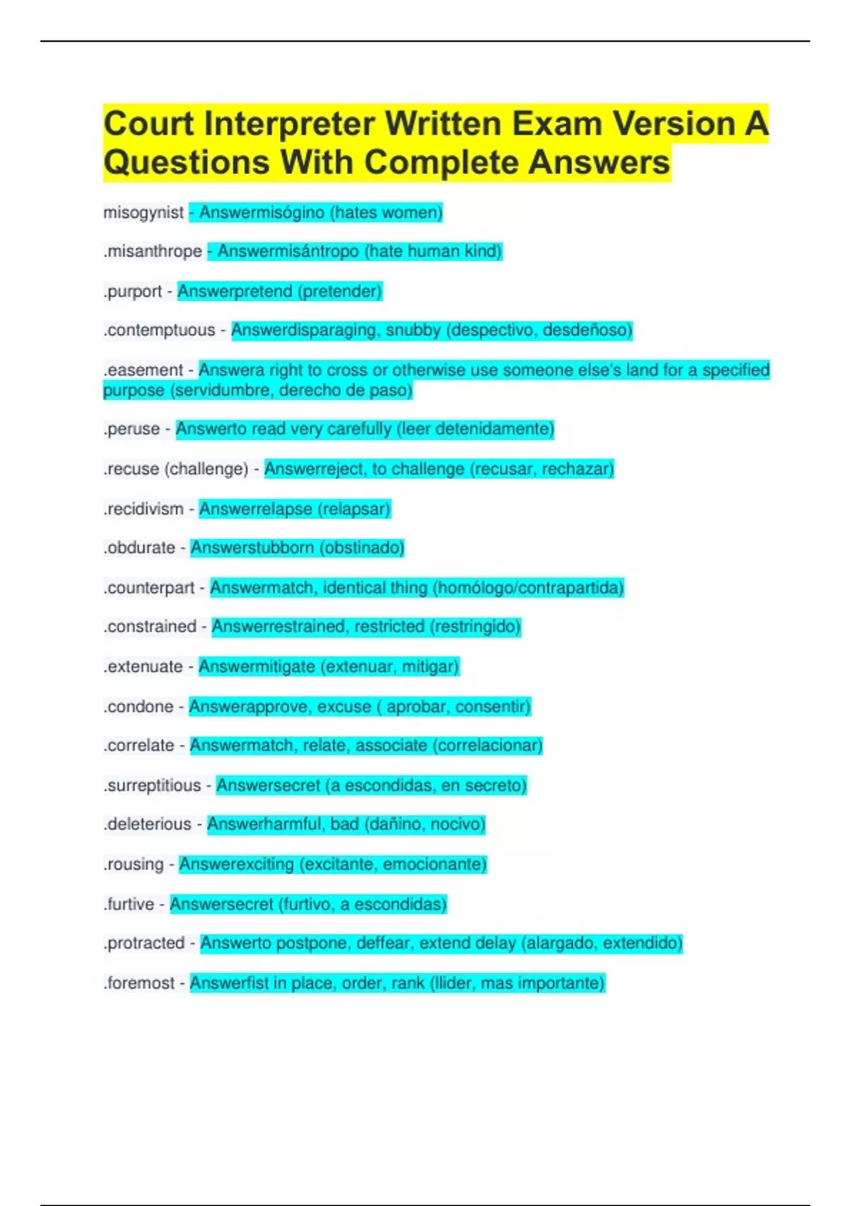 Court Interpreter Written Exam Version A Questions With Complete Answers misogynist - Answermisógino (hates women) .misanthrope - Answermisántropo (hate human kind) .purport - Answerpretend (pretender) .contemptuous - Answerdisparaging, snubby (despectivo, desdeñoso) .easement - Answera right to cross or otherwise use someone else's land for a specified purpose (servidumbre, derecho de paso) .peruse - Answerto read very carefully (leer detenidamente) .recuse (challenge) - Answerreject, to challenge (recusar, rechazar) .recidivism - Answerrelapse (relapsar) .obdurate - Answerstubborn (obstinado) .counterpart - Answermatch, identical thing (homólogo/contrapartida) .constrained - Answerrestrained, restricted (restringido) .extenuate - Answermitigate (extenuar, mitigar) .condone - Answerapprove, excuse ( aprobar, consentir) .correlate - Answermatch, relate, associate (correlacionar) .surreptitious - Answersecret (a escondidas, en secreto) .deleterious - Answerharmful, bad (dañino, nocivo) .rousing - Answerexciting (excitante, emocionante) .furtive - Answersecret (furtivo, a escondidas) .protracted - Answerto postpone, deffear, extend delay (alargado, extendido) .foremost - Answerfist in place, order, rank (llider, mas importante)