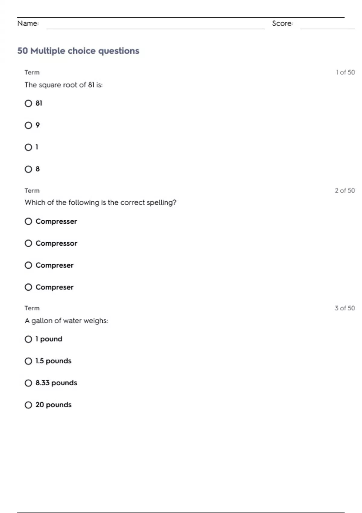 50 Multiple choice questions