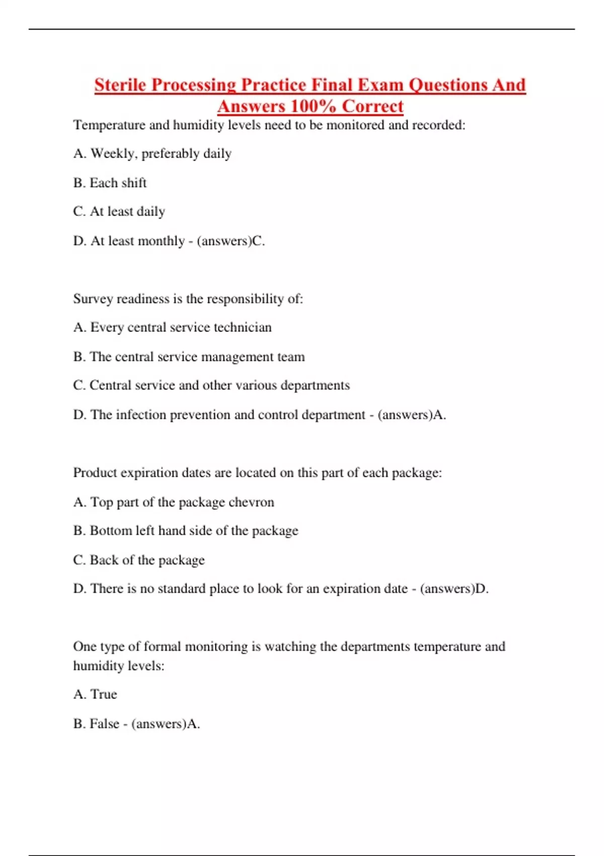 Sterile Processing Practice Final Exam Questions And Answers 100% Correct