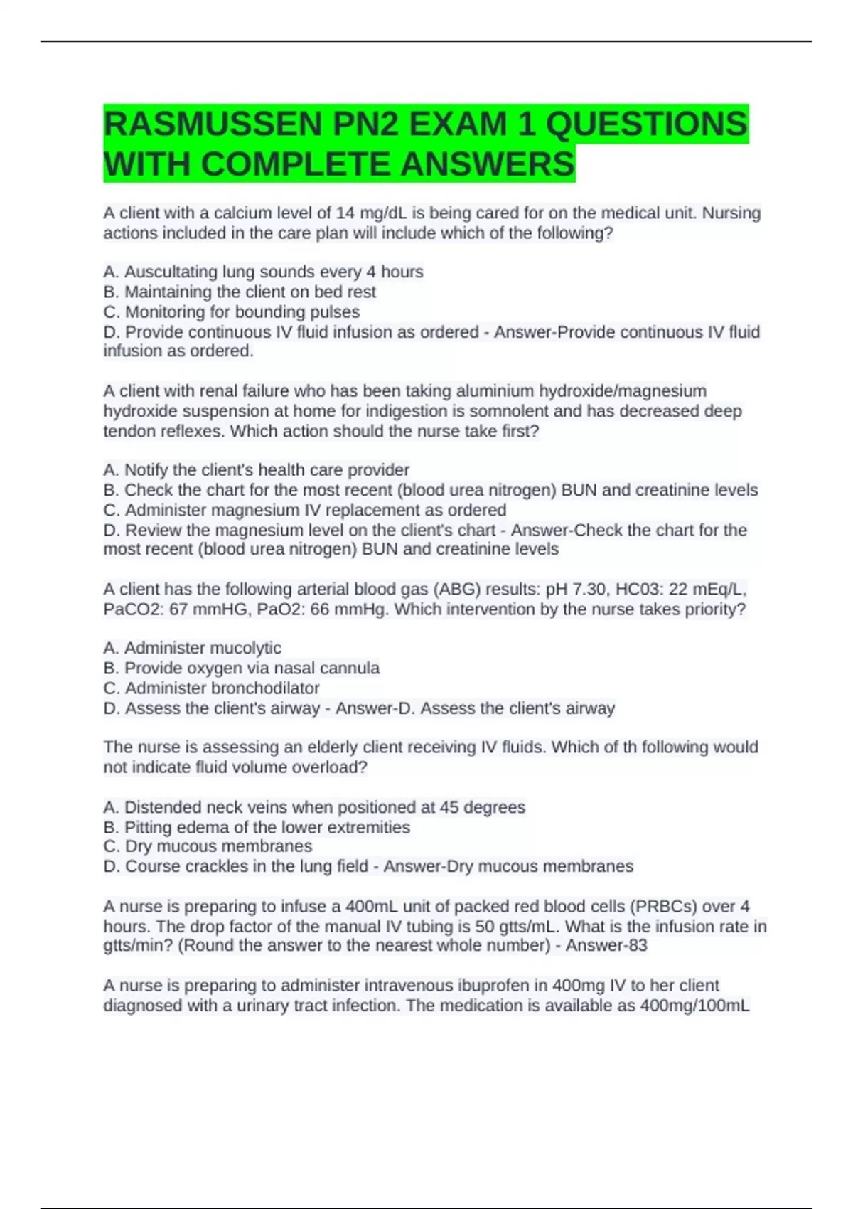 RASMUSSEN PN2 EXAM 1 QUESTIONS WITH COMPLETE ANSWERS