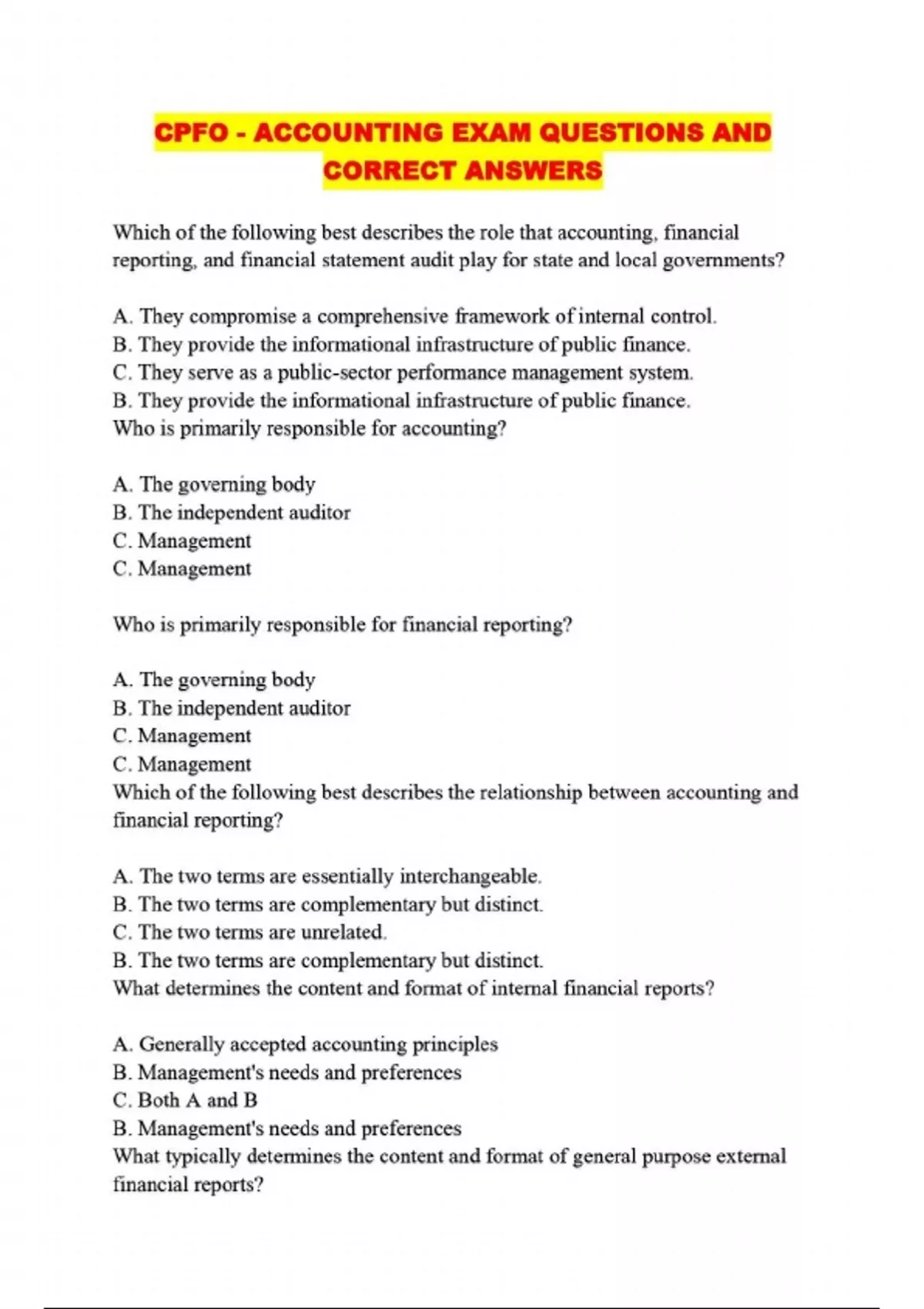 CPFO - ACCOUNTING EXAM QUESTIONS AND CORRECT ANSWERS