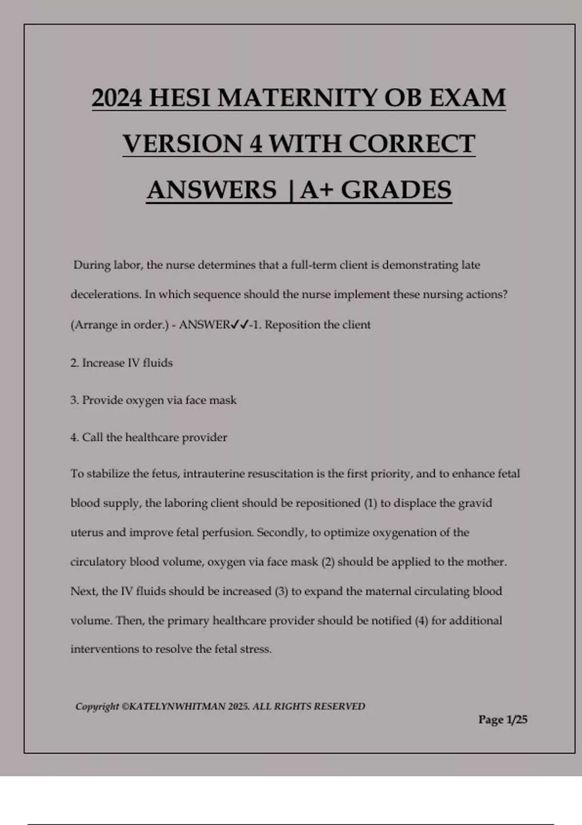 2024 HESI MATERNITY OB EXAM VERSION 4 WITH CORRECT ANSWERS |A+ GRADES During labor, the nurse determines that a full-term client is demonstrating late decelerations. In which sequence should the nurse implement these nursing actions? (Arrange in order.) - ANSWER-1. Reposition the client 2. Increase IV fluids 3. Provide oxygen via face mask 4. Call the healthcare provider To stabilize the fetus, intrauterine resuscitation is the first priority, and to enhance fetal blood supply, the laboring client should be repositioned (1) to displace the gravid uterus and improve fetal perfusion. Secondly, to optimize oxygenation of the circulatory blood volume, oxygen via face mask (2) should be applied to the mother. Next, the IV fluids should be increased (3) to expand the maternal circulating blood volume. Then, the primary healthcare provider should be notified (4) for additional interventions to resolve the fetal stress. Copyright ©KATELYNWHITMAN 2025. ALL RIGHTS RESERVED Page 2/25 A client with NO prenatal care arrives at the labor unit screaming, "The baby is coming!" The nurse performs a vaginal examination that reveals the cervix is 3 centimeters dilated and 75% effaced. What additional information is most important for the nurse to obtain? - ANSWER-Date of last normal menstrual period: Evaluating the gestation of the pregnancy takes priority. If the fetus is preterm and the fetal heart pattern is reassuring, the healthcare provider may attempt to prolong the pregnancy and administer corticosteroids to mature the lungs of the fetus. A 38-week primigravida who works as a secretary and sits at a computer for 8 hours each day tells the nurse that her feet have begun to swell. Which instruction would be most effective in preventing pooling of blood in the lower extremities? - ANSWER- Move about every hour: Pooling of blood in the lower extremities results from the enlarged uterus exerting pressure on the pelvic veins. Moving about every hour will straighten out the pelvic veins and increase venous return. 2. A 26-year-old, gravida 2, para 1 client is admitted to the hospital at 28-weeks gestation in preterm labor. She is given 3 doses of terbutaline sulfate (Brethine) 0.25 mg subcutaneously to stop her labor contractions. The nurse plans to monitor for which primary side effect of terbutaline sulfate? - ANSWER-Tachycardia and a feeling of nervousness: Copyright ©KATELYNWHITMAN 2025. ALL RIGHTS RESERVED Page 3/25 Terbutaline sulfate (Brethine), a beta-sympathomimetic drug, stimulates beta- adrenergic receptors in the uterine muscle to stop contractions. The beta-adrenergic agonist properties of the drug may cause tachycardia, increased cardiac output, restlessness, headache, and a feeling of "nervousness" When do the anterior and posterior fontanels close? - ANSWER-anterior fontanel closes at 12 to 18 months and the posterior by the end of the second month. When assessing a client who is at 12-weeks gestation, the nurse recommends that she and her husband consider attending childbirth preparation classes. When is the best time for the couple to attend these classes? - ANSWER-30 weeks gestation: at 30 weeks gestation is closest (of the options) to the time parents would be ready for such classes. Learning is facilitated by an interested pupil! The couple is most interested in childbirth toward the end of the pregnancy when they are psychologically ready for the termination of the pregnancy, and the birth of their child is an immediate concern The nurse should encourage the laboring client to begin pushing when... - ANSWER-the cervix is completely dilated: Pushing begins with the second stage of labor, i.e., when the cervix is completely dilated at 10 cm (C). If pushing begins before the cervix is completely dilated the cervix Copyright ©KATELYNWHITMAN 2025. ALL RIGHTS RESERVED Page 4/25 can become edematous and may never completely dilate, necessitating an operative delivery. Many primigravida's begin active labor 100% effaced and then proceed to dilate. The nurse instructs a laboring client to use accelerated-blow breathing. The client begins to complain of tingling fingers and dizziness. What action should the nurse take? - ANSWER-Have the client breathe into her cupped hands: Tingling fingers and dizziness are signs of hyperventilation (blowing off too much carbon dioxide). Hyperventilation is treated by retaining carbon dioxide. This can be facilitated by breathing into a paper bag or cupped hands Twenty-four hours after admission to the newborn nursery, a full-term male infant develops localized edema on the right side of his head. The nurse knows that, in the newborn, an accumulation of blood between the periosteum and skull which does not cross the suture line is a newborn variation known as... - ANSWER-a cephalohematoma, caused by forceps trauma and may last up to 8 weeks: Cephalohematoma, a slight abnormal variation of the newborn, usually arises within the first 24 hours after delivery. Trauma from delivery c