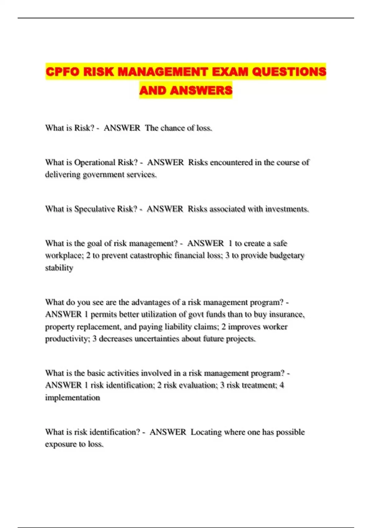 CPFO RISK MANAGEMENT EXAM QUESTIONS AND ANSWERS...