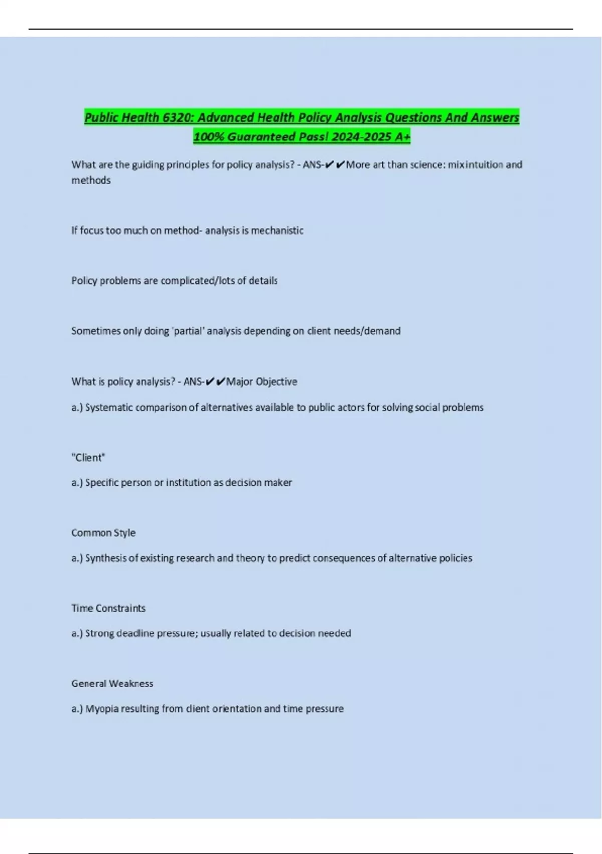 Public Health 6320: Advanced Health Policy Analysis Questions And Answers 100% Guaranteed Pass! A+ What are the guiding principles for policy analysis? - ANS-More art than science: mix intuition and methods If focus too much on method- analysis is mechanistic Policy problems are complicated/lots of details Sometimes only doing 'partial' analysis depending on client needs/demand What is policy analysis? - ANS-Major Objective a.) Systematic comparison of alternatives available to public actors for solving social problems "Client" a.) Specific person or institution as decision maker Common Style a.) Synthesis of existing research and theory to predict consequences of alternative policies Time Constraints a.) Strong deadline pressure; usually related to decision needed General Weakness a.) Myopia resulting from client orientation and time pressure What is a descriptive policy analysis? - ANS-Also called ex-post, post hoc, retrospective Retrospective analysis: descriptive interpretation of past policies; descriptive focus on what was implemented Evaluative analysis: summative program evaluation; were the purposes of the policy achieved; did the policy have an impact? What is a prospective policy analysis? - ANS-Also called ex ante, pre hoc, anticipatory Predictive analysis: Projection of future states resulting from adopting particular alternatives Prescriptive analysis: Recommends actions because they will bring about a particular result What are some techniques for policy analysis and policy research? - ANS-"Back of the envelope" calculations Descriptive statistics Forecasting methods Simulations Markov models Life tables CONTINUES....
