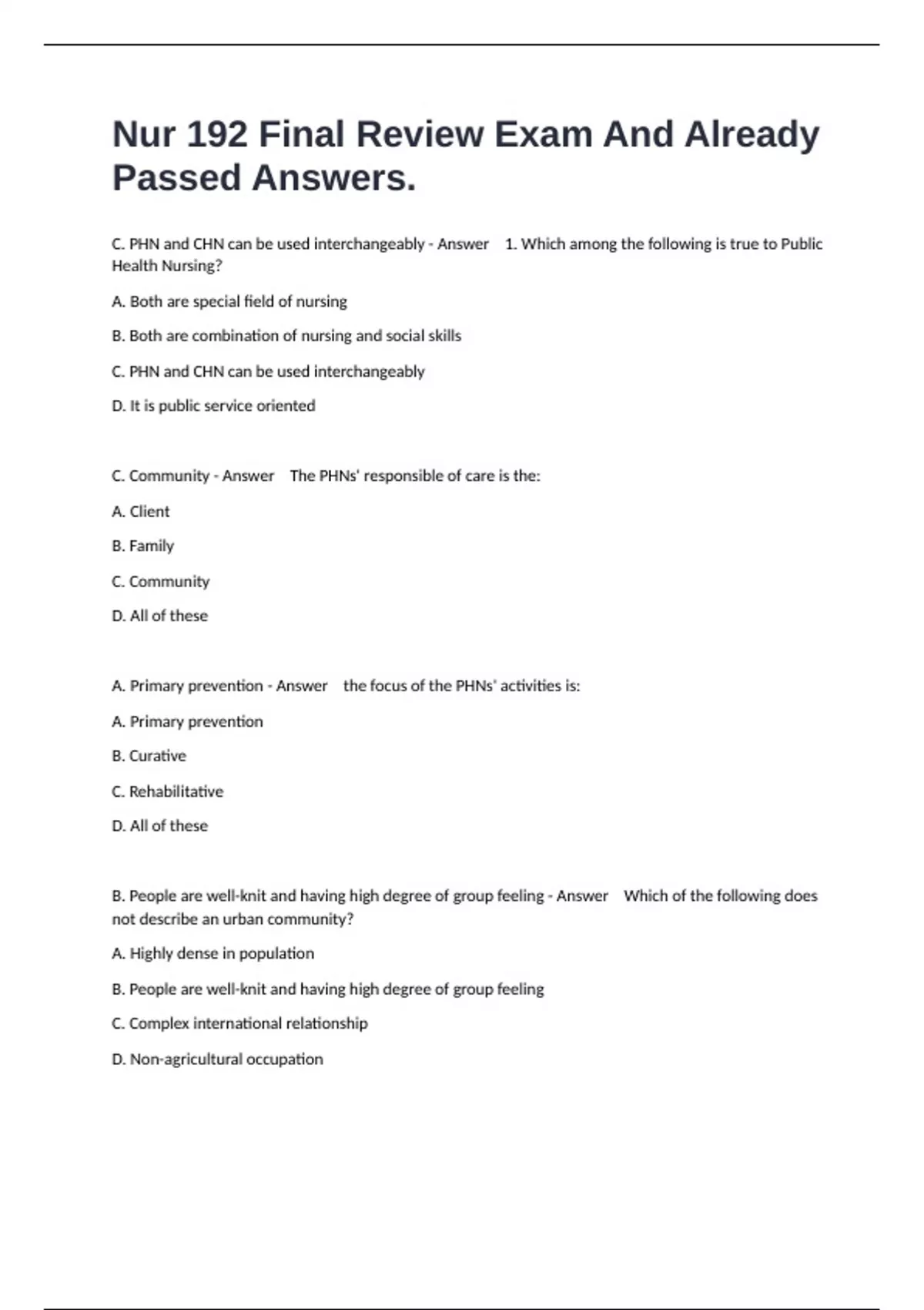 C. PHN and CHN can be used interchangeably - Answer 1. Which among the following is true to Public Health Nursing? A. Both are special field of nursing B. Both are combination of nursing and social skills C. PHN and CHN can be used interchangeably D. It is public service oriented C. Community - Answer The PHNs' responsible of care is the: A. Client B. Family C. Community D. All of these A. Primary prevention - Answer the focus of the PHNs' activities is: A. Primary prevention B. Curative C. Rehabilitative D. All of these B. People are well-knit and having high degree of group feeling - Answer Which of the following does not describe an urban community? A. Highly dense in population B. People are well-knit and having high degree of group feeling C. Complex international relationship D. Non-agricultural occupation