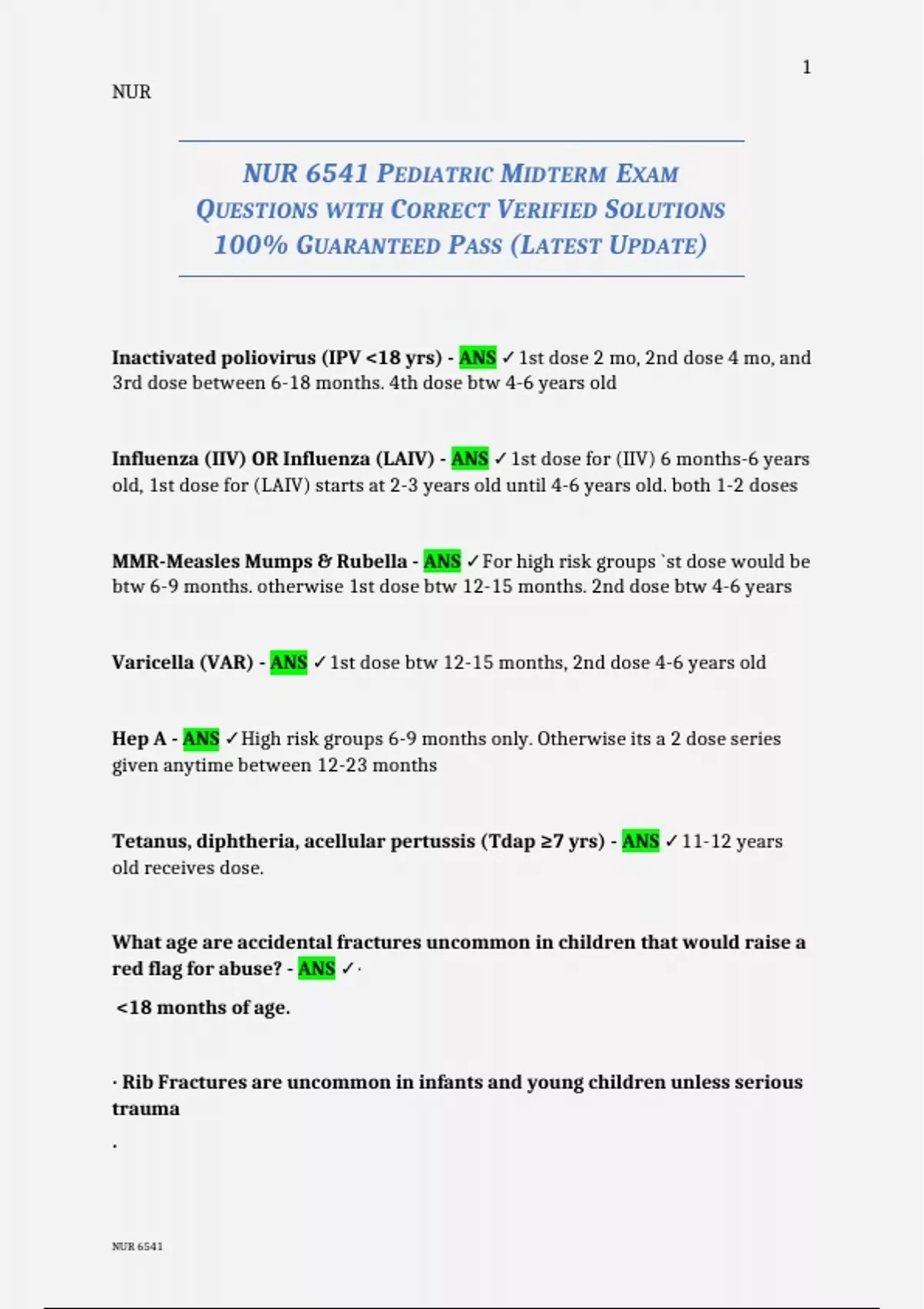 NUR 6541 PEDIATRIC MIDTERM EXAM QUESTIONS WITH CORRECT VERIFIED SOLUTIONS 100% GUARANTEED PASS (LATEST UPDATE)