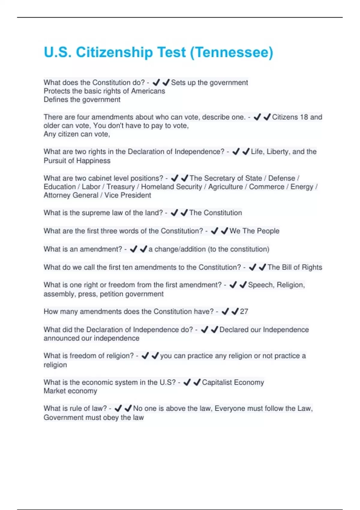 What does the Constitution do? - ️️Sets up the government Protects the basic rights of Americans Defines the government There are four amendments about who can vote, describe one. - ️️Citizens 18 and older can vote, You don't have to pay to vote, Any citizen can vote, What are two rights in the Declaration of Independence? - ️️Life, Liberty, and the Pursuit of Happiness What are two cabinet level positions? - ️️The Secretary of State / Defense / Education / Labor / Treasury / Homeland Security / Agriculture / Commerce / Energy / Attorney General / Vice President What is the supreme law of the land? - ️️The Constitution What are the first three words of the Constitution? - ️️We The People What is an amendment? - ️️a change/addition (to the constitution) What do we call the first ten amendments to the Constitution? - ️️The Bill of Rights What is one right or freedom from the first amendment? - ️️Speech, Religion, assembly, press, petition government How many amendments does the Constitution have? - ️️27 What did the Declaration of Independence do? - ️️Declared our Independence announced our independence What is freedom of religion? - ️️you can practice any religion or not practice a religion What is the economic system in the U.S? - ️️Capitalist Economy Market economy What is rule of law? - ️️No one is above the law, Everyone must follow the Law, Government must obey the lawName one branch or part of government. - ️️congress, legislative, president, executive, the court, or judicial What stops one branch of government from becoming too powerful? - ️️Seperation of Powers or Checks and Balances Who is in charge of the executive branch? - ️️The President