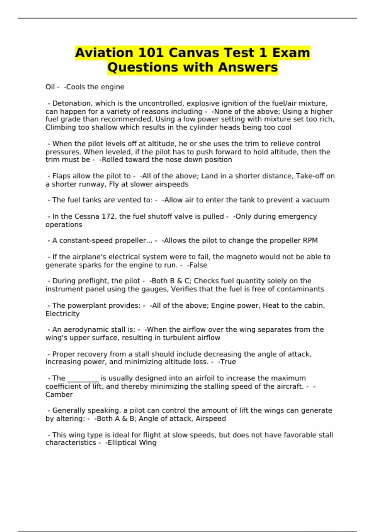 Aviation 101 Canvas Test 1 Exam