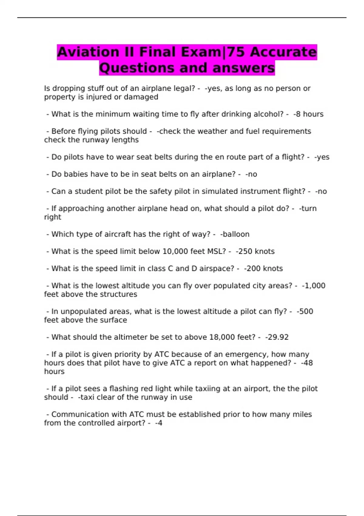 Aviation II Final Exam|75 Accurate Questions and answers