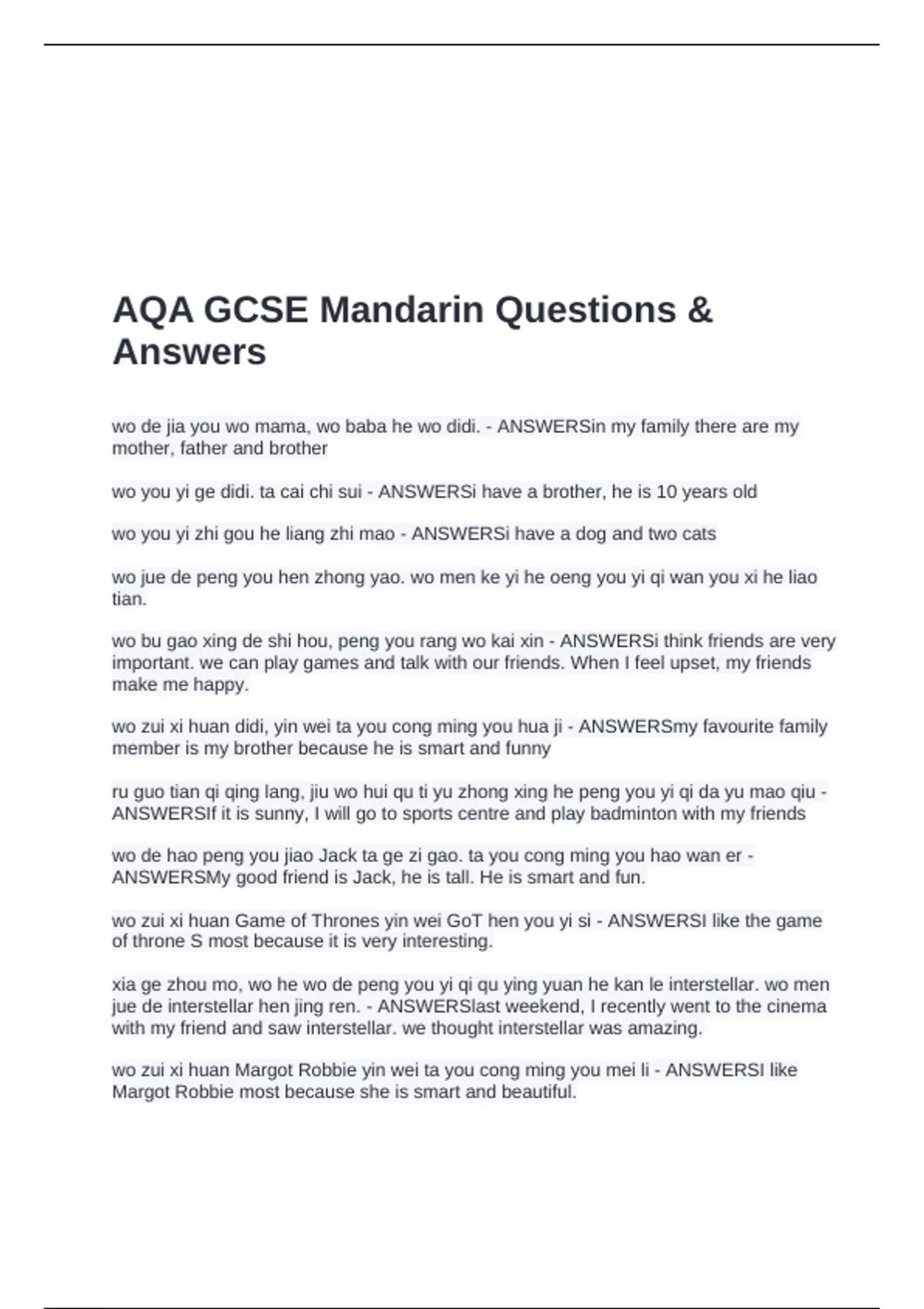 wo de jia you wo mama, wo baba he wo didi. - ANSWERSin my family there are my mother, father and brother wo you yi ge didi. ta cai chi sui - ANSWERSi have a brother, he is 10 years old wo you yi zhi gou he liang zhi mao - ANSWERSi have a dog and two cats wo jue de peng you hen zhong yao. wo men ke yi he oeng you yi qi wan you xi he liao tian. wo bu gao xing de shi hou, peng you rang wo kai xin - ANSWERSi think friends are very important. we can play games and talk with our friends. When I feel upset, my friends make me happy. wo zui xi huan didi, yin wei ta you cong ming you hua ji - ANSWERSmy favourite family member is my brother because he is smart and funny ru guo tian qi qing lang, jiu wo hui qu ti yu zhong xing he peng you yi qi da yu mao qiu - ANSWERSIf it is sunny, I will go to sports centre and play badminton with my friends wo de hao peng you jiao Jack ta ge zi gao. ta you cong ming you hao wan er - ANSWERSMy good friend is Jack, he is tall. He is smart and fun. wo zui xi huan Game of Thrones yin wei GoT hen you yi si - ANSWERSI like the game of throne S most because it is very interesting. xia ge zhou mo, wo he wo de peng you yi qi qu ying yuan he kan le interstellar. wo men jue de interstellar hen jing ren. - ANSWERSlast weekend, I recently went to the cinema with my friend and saw interstellar. we thought interstellar was amazing. wo zui xi huan Margot Robbie yin wei ta you cong ming you mei li - ANSWERSI like Margot Robbie most because she is smart and beautiful. wo hen xi huan shang wang yin wei wo chang chang shang wang kan shu - ANSWERSI like to surf the net wo mei tian dou yong shou ji fa duan xin, you shi hou yong shou ji ting yin yue. - ANSWERSI everyday use my phone to send message. Sometimes I use my phone to listen to music. wo yong shou ji he peng you liao tian er - ANSWERSI use my mobile phone to chat with my friends. ru guo mei you shou ji, wo jiu kan shu he zuo yun dong - ANSWERSif no phones, i then read and do exercise wo zui xi huan Instagram yin wei wo xi huan kan shi pin - ANSWERSI like Instagram most because I like watching videos. wo de ai hao shi da yu mao qiu, wo mei xing qi liu da yi xiao shi wang qiu - ANSWERSMy hobby is playing badminton, every saturday I play badminton for an hour wo xi huan da yu mao qiu yin wei ke yi duan lian shen ti - ANSWERSI like to play badminton because I can exercise ru guo xia yu wo jiu zai jia ting yin le - ANSWERSIf it rains I then stay home and listen to music you kong shi wo xi huan wan er dian nao you xi, wo zui xi huan de dian nao you xi shi FIFA - ANSWERSWhen I am free I like to play computer games, my favourite game is FIFA wo chang chang gen gege yi qi wan - ANSWERSI often play FIFA with my brother wo xiao shi hou chang chang he didi yi qi qu gong yuan qi zi xing che - ANSWERSWhen I was young, I often ride bike with brother in the park shi de, wo yi zhou da san ci gan lan qiu - ANSWERSyes, i play rugby three times a week wo zui xi huan you yong yin wei you yong shi hen hao wan de yun dong, dui jian kang you hao chu - ANSWERSi like to swim because it is a fun sport. And it is good to your health. wo you shi hou can jia gan lan qiu ju le bu, you shi hou can jia dian ying ju le bu - ANSWERSi sometimes join rugby club sometimes join film clubs wo zui xi huan Arsenal, yin wei wo jue de ta men hen nu li - ANSWERSmy favourite football team is Arsenal wo jiao de yun dong hen zhong yao yin wei neng duan lian shen ti ,yin wei yun dong rang wo jian kang - ANSWERSi think exercise is important because I can tran my body zuo tian wan shang wo he jia ren yi qi qu le dian ying yuan - ANSWERSyesterday evening I went to the cinema with my family xia ge zhou mo wo xiang zuo huo che qu lun dun de bo wu guan. ru guo tian qi hao, wo jiuhe wo de peng youyi qi qu hai bian san bu - ANSWERSI want to take the train to the museum in London next weekend. If the weather is good, I will go for a walk with my friends. wo ren wei chun jie bu zhong yao, yin wei zai ying guo bu qing zhu chun jie - ANSWERSi think chinese new year is not important, because in UK people don't celebrate Chinese New Year