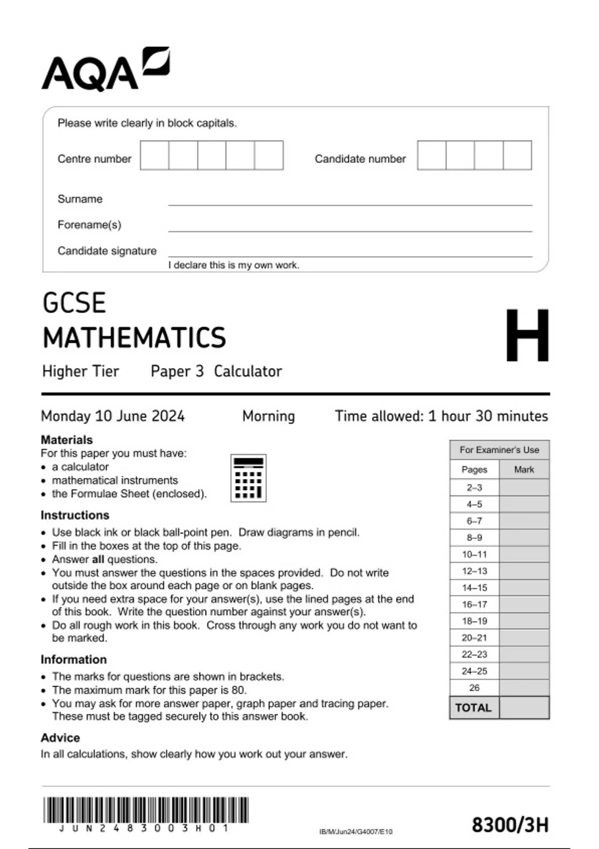 AQA GCSE MATHEMATICS Higher Tier Paper 3 JUNE 2024 QUESTION PAPER