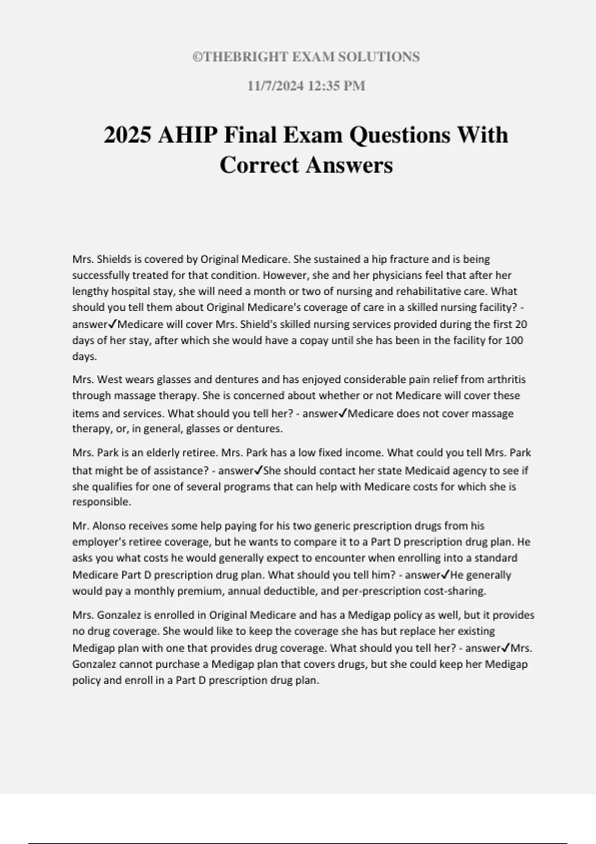 2025 AHIP Final Exam Questions With Correct Answers Mrs. Shields is covered by Original Medicare. She sustained a hip fracture and is being successfully treated for that condition. However, she and her physicians feel that after her lengthy hospital stay, she will need a month or two of nursing and rehabilitative care. What should you tell them about Original Medicare's coverage of care in a skilled nursing facility? - answerMedicare will cover Mrs. Shield's skilled nursing services provided during the first 20 days of her stay, after which she would have a copay until she has been in the facility for 100 days. Mrs. West wears glasses and dentures and has enjoyed considerable pain relief from arthritis through massage therapy. She is concerned about whether or not Medicare will cover these items and services. What should you tell her? - answerMedicare does not cover massage therapy, or, in general, glasses or dentures. Mrs. Park is an elderly retiree. Mrs. Park has a low fixed income. What could you tell Mrs. Park that might be of assistance? - answerShe should contact her state Medicaid agency to see if she qualifies for one of several programs that can help with Medicare costs for which she is responsible. Mr. Alonso receives some help paying for his two generic prescription drugs from his employer's retiree coverage, but he wants to compare it to a Part D prescription drug plan. He asks you what costs he would generally expect to encounter when enrolling into a standard Medicare Part D prescription drug plan. What should you tell him? - answerHe generally would pay a monthly premium, annual deductible, and per-prescription cost-sharing. Mrs. Gonzalez is enrolled in Original Medicare and has a Medigap policy as well, but it provides no drug coverage. She would like to keep the coverage she has but replace her existing Medigap plan with one that provides drug coverage. What should you tell her? - answerMrs. Gonzalez cannot purchase a Medigap plan that covers drugs, but she could keep her Medigap policy and enroll in a Part D prescription drug plan. ©THEBRIGHT EXAM SOLUTIONS 11/7/2024 12:35 PM Mr. Davis is 52 years old and has recently been diagnosed with end-stage renal disease (ESRD) and will soon begin dialysis. He is wondering if he can obtain coverage under Medicare. What should you tell him? - answerHe may sign-up for Medicare at any time however coverage usually begins on the fourth month after dialysis treatments start. Mrs. Duarte is enrolled in Original Medicare Parts A and B. She has recently reviewed her Medicare Summary Notice (MSN) and disagrees with a determination that partially denied one of her claims for services. What advice would you give her? - answerMrs. Duarte should file an appeal of this initial determination within 120 days of the date she received the MSN in the mail. Mrs. Geisler's neighbor told her she should look at her Part D options during the annual Medicare enrollment period because the features of Part D might have changed. Mrs. Geisler can't remember what Part D is so she called you to ask what her neighbor was talking about. What could you tell her? - answerPart D covers prescription drugs and she should look at her premiums, formulary, and cost-sharing among other factors to see if they have changed. Mr. Rainey is experiencing paranoid delusions and his physician feels that he should be hospitalized. What should you tell Mr. Rainey (or his representative) about the length of an inpatient psychiatric hospital stay that Medicare will cover? - answerMedicare will cover a total of 190 days of inpatient psychiatric care during Mr. Rainey's entire lifetime. Mr. Xi will soon turn age 65 and has come to you for advice as to what services are provided under Original Medicare. What should you tell Mr. Xi that best describes the health coverage provided to Medicare beneficiaries? - answerBeneficiaries under Original Medicare have no cost-sharing for most preventive services. Mr. Singh would like drug coverage but does not want to be enrolled in a Medicare Advantage plan. What should you tell him? - answerMr. Singh can enroll in a stand-alone prescription drug plan and continue to be covered for Part A and Part B services through Original Fee-for- Service Medicare. Mrs. Chen will be 65 soon, has been a citizen for twelve years, has been employed full time, and paid taxes during that entire period. She is concerned that she will not qualify for coverage under part A because she was not born in the United States. What should you tell her? - answerMost individuals who are citizens and age 65 or over are covered under Part A by virtue of having paid Medicare taxes while working, though some may be covered as a result of paying monthly premiums. Mrs. Quinn recently turned 66 and decided after many years of work to retire and begin receiving Social Security benefits. Shortly thereafter Mrs. Quinn received a letter informing her
