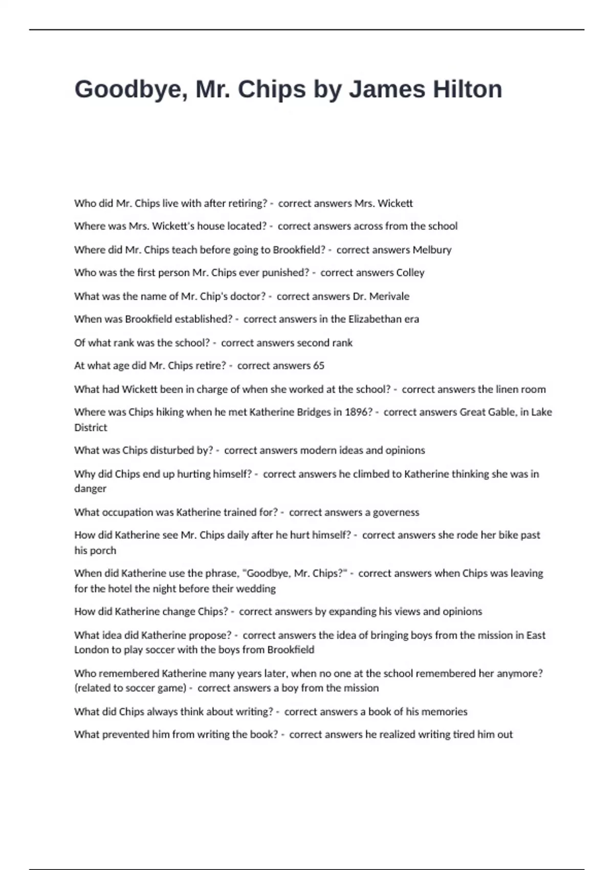 Goodbye, Mr. Chips by James Hilton Who did Mr. Chips live with after retiring? - correct answers Mrs. Wickett Where was Mrs. Wickett's house located? - correct answers across from the school Where did Mr. Chips teach before going to Brookfield? - correct answers Melbury Who was the first person Mr. Chips ever punished? - correct answers Colley What was the name of Mr. Chip's doctor? - correct answers Dr. Merivale When was Brookfield established? - correct answers in the Elizabethan era Of what rank was the school? - correct answers second rank At what age did Mr. Chips retire? - correct answers 65 What had Wickett been in charge of when she worked at the school? - correct answers the linen room Where was Chips hiking when he met Katherine Bridges in 1896? - correct answers Great Gable, in Lake District What was Chips disturbed by? - correct answers modern ideas and opinions Why did Chips end up hurting himself? - correct answers he climbed to Katherine thinking she was in danger What occupation was Katherine trained for? - correct answers a governess How did Katherine see Mr. Chips daily after he hurt himself? - correct answers she rode her bike past his porch When did Katherine use the phrase, "Goodbye, Mr. Chips?" - correct answers when Chips was leaving for the hotel the night before their wedding How did Katherine change Chips? - correct answers by expanding his views and opinions What idea did Katherine propose? - correct answers the idea of bringing boys from the mission in East London to play soccer with the boys from Brookfield Who remembered Katherine many years later, when no one at the school remembered her anymore? (related to soccer game) - correct answers a boy from the mission What did Chips always think about writing? - correct answers a book of his memories What prevented him from writing the book? - correct answers he realized writing tired him out
