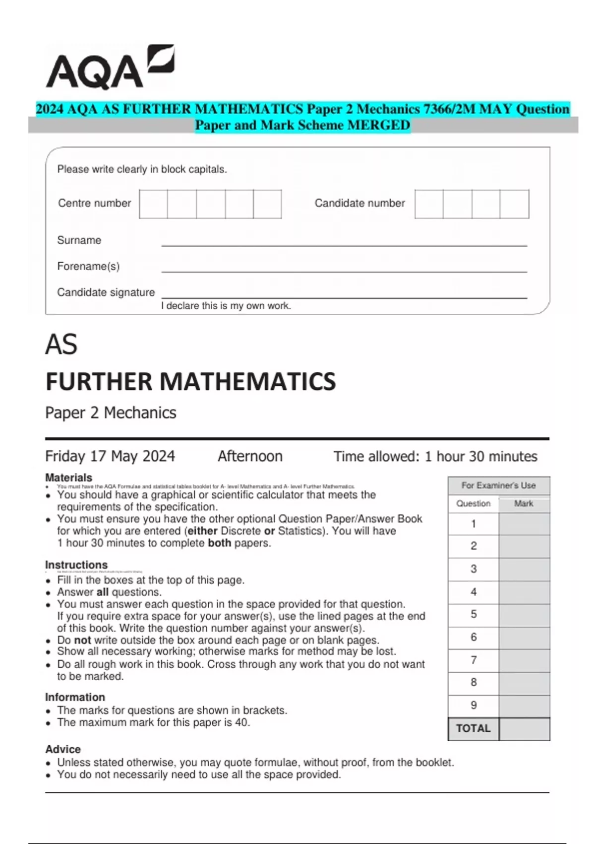 2024 AQA AS FURTHER MATHEMATICS Paper 2 Mechanics 7366/2M MAY Question