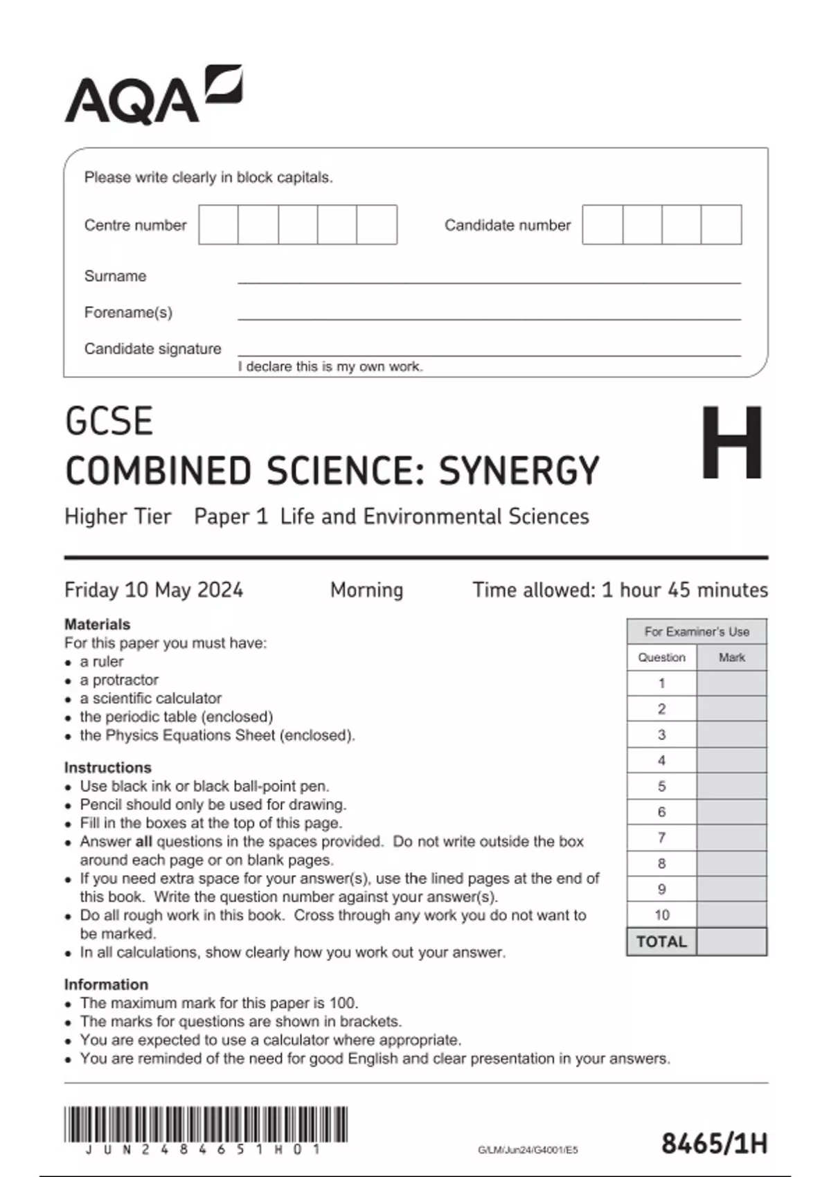 AQA GCSE COMBINED SCIENCE: SYNERGY Higher Tier Paper 1 JUNE 2024 QUESTION PAPER
