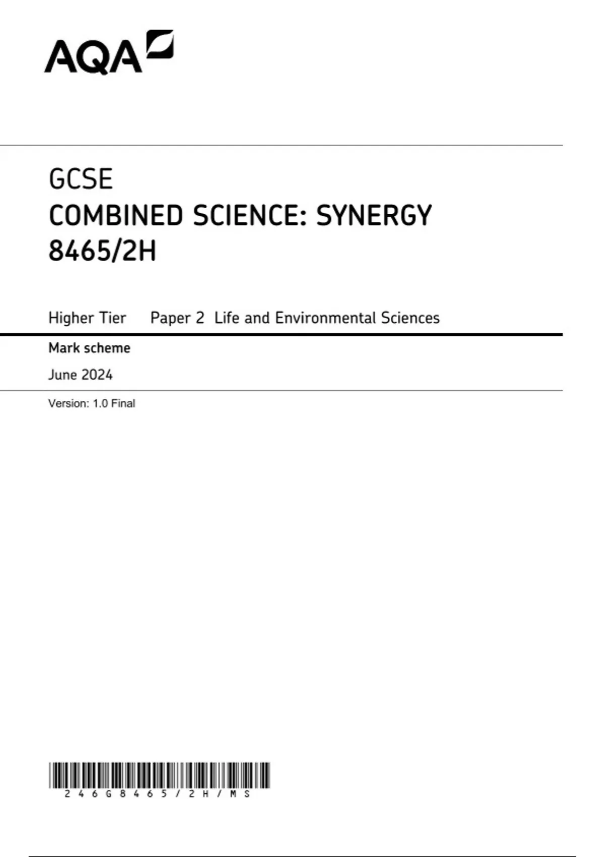 AQA GCSE COMBINED SCIENCE: SYNERGY Higher Tier Paper 2 JUNE 2024 MARK SCHEME