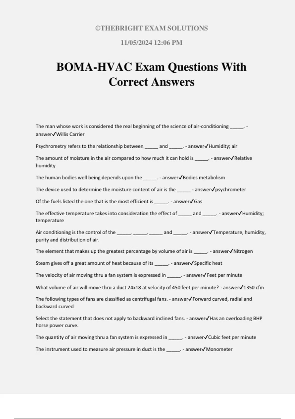 BOMA-HVAC Exam Questions With Correct Answers The man whose work is considered the real beginning of the science of air-conditioning _____. - answerWillis Carrier Psychrometry refers to the relationship between _____ and _____. - answerHumidity; air The amount of moisture in the air compared to how much it can hold is _____. - answerRelative humidity The human bodies well being depends upon the _____. - answerBodies metabolism The device used to determine the moisture content of air is the _____ - answerpsychrometer Of the fuels listed the one that is the most efficient is _____. - answerGas The effective temperature takes into consideration the effect of _____ and _____. - answerHumidity; temperature Air conditioning is the control of the _____, _____, _____ and _____. - answerTemperature, humidity, purity and distribution of air. The element that makes up the greatest percentage by volume of air is _____. - answerNitrogen Steam gives off a great amount of heat because of its _____. - answerSpecific heat The velocity of air moving thru a fan system is expressed in _____. - answerFeet per minute What volume of air will move thru a duct 24x18 at velocity of 450 feet per minute? - answer1350 cfm The following types of fans are classified as centrifugal fans. - answerForward curved, radial and backward curved Select the statement that does not apply to backward inclined fans. - answerHas an overloading BHP horse power curve. The quantity of air moving thru a fan system is expressed in _____. - answerCubic feet per minute The instrument used to measure air pressure in duct is the _____. - answerMonometer