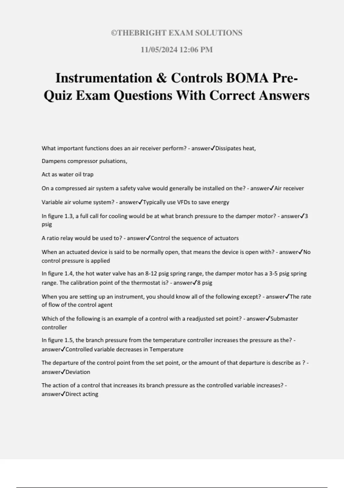 Instrumentation & Controls BOMA Pre- Quiz Exam Questions With Correct Answers