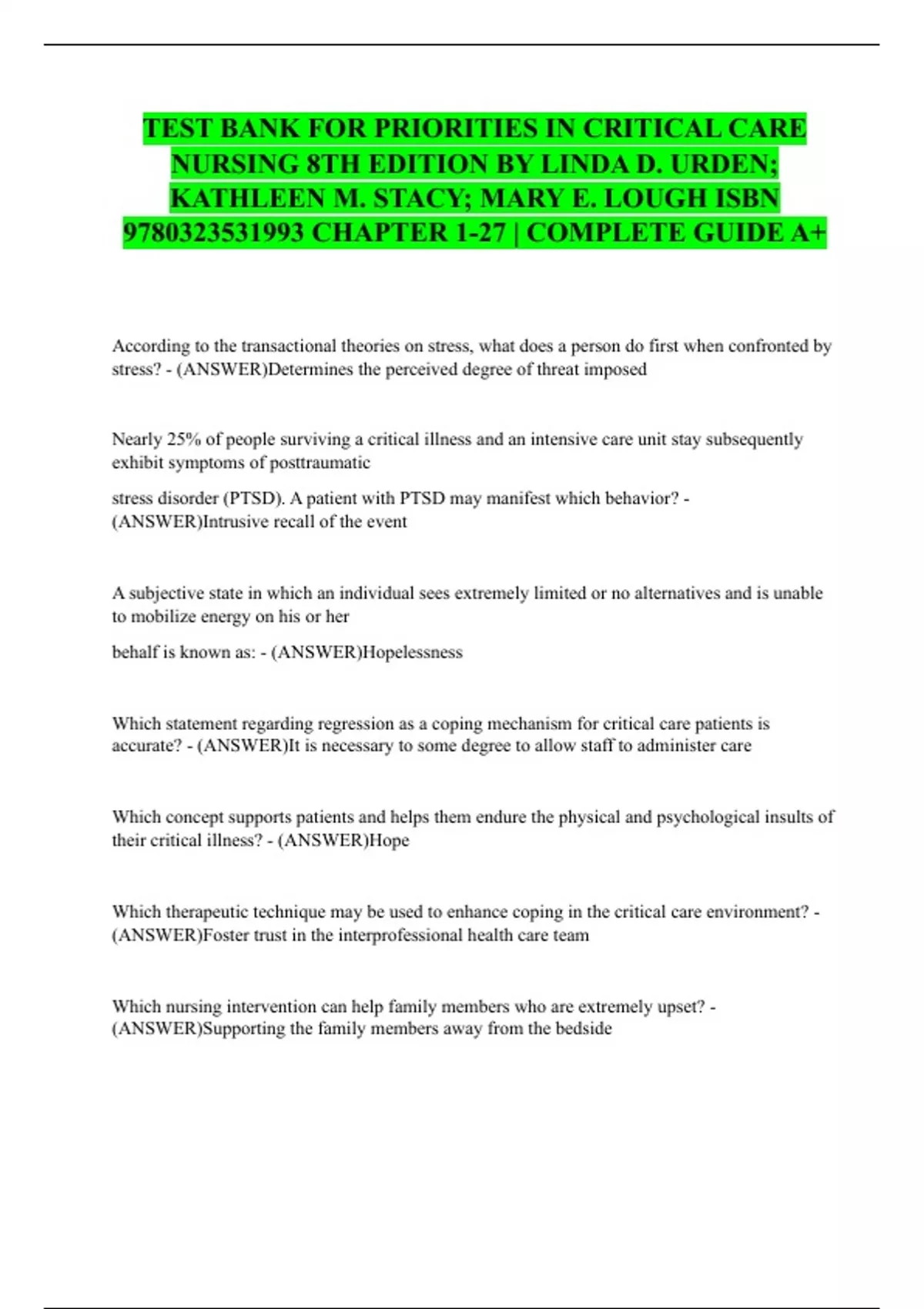 Test Bank For Priorities in Critical Care Nursing 8th Edition By Linda D. Urden; Kathleen M. Stacy; Mary E. Lough ISBN 9780323531993 Chapter 1-27 | Complete Guide A+