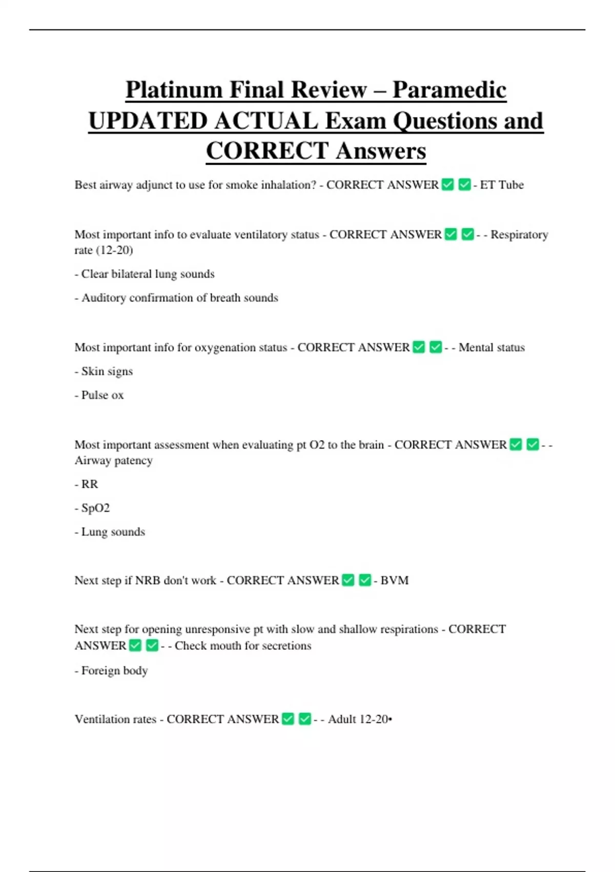 Platinum Final Review – Paramedic UPDATED ACTUAL Exam Questions and CORRECT Answers Best airway adjunct to use for smoke inhalation? - CORRECT ANSWER - ET Tube Most important info to evaluate ventilatory status - CORRECT ANSWER - - Respiratory rate (12-20) - Clear bilateral lung sounds - Auditory confirmation of breath sounds