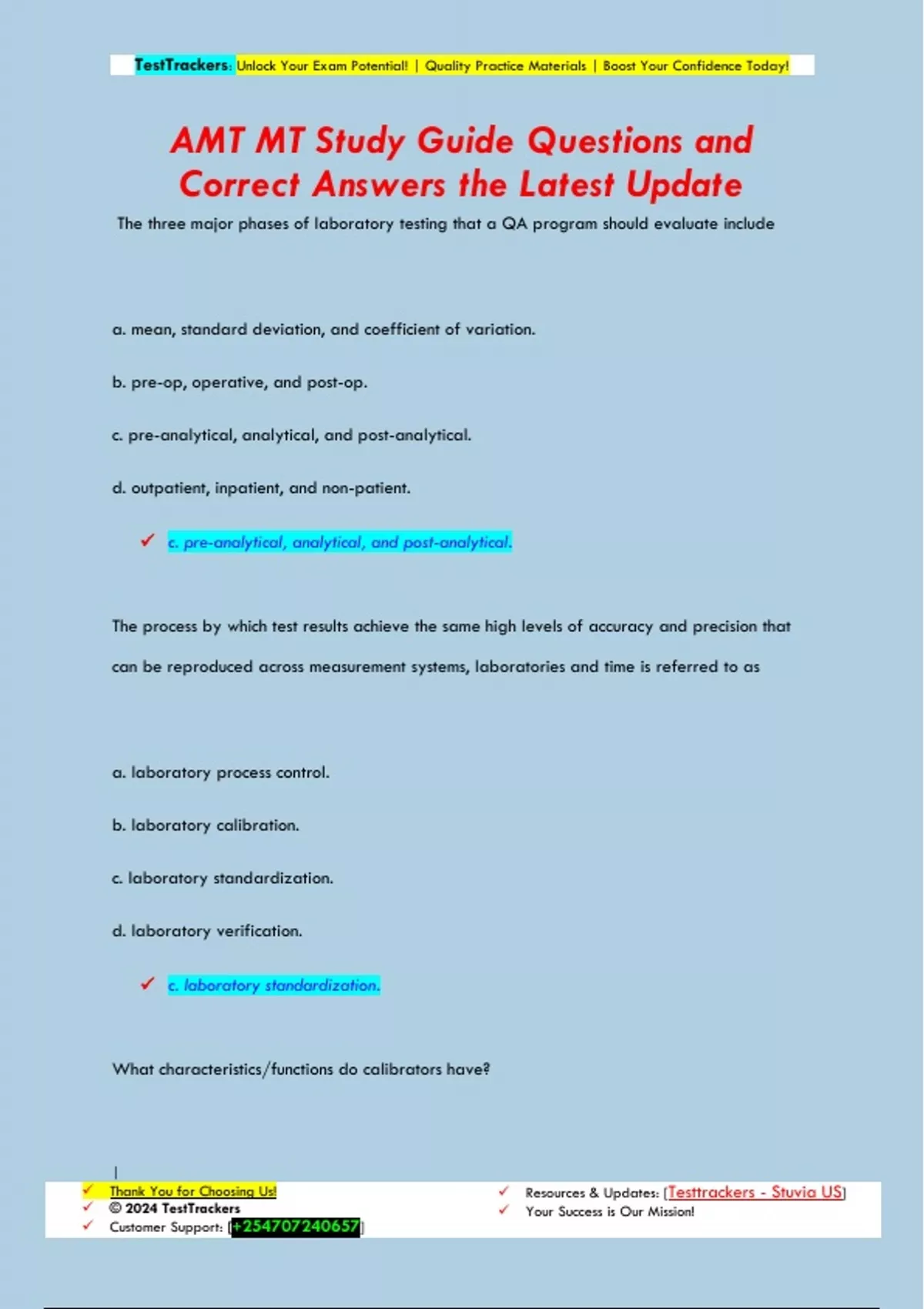 The three major phases of laboratory testing that a QA program should evaluate include a. mean, standard deviation, and coefficient of variation. b. pre-op, operative, and post-op. c. pre-analytical, analytical, and post-analytical. d. outpatient, inpatient, and non-patient. c. pre-analytical, analytical, and post-analytical. The process by which test results achieve the same high levels of accuracy and precision that can be reproduced across measurement systems, laboratories and time is referred to as a. laboratory process control. b. laboratory calibration. c. laboratory standardization. d. laboratory verification. c. laboratory standardization. What characteristics/functions do calibrators have? TestTrackers: Unlock Your Exam Potential! | Quality Practice Materials | Boost Your Confidence Today! | Thank You for Choosing Us! © 2024 TestTrackers Customer Support: [] Resources & Updates: [Testtrackers - Stuvia US] Your Success is Our Mission! a. They contain a known amount of analyte being tested. b. They monitor the quality of reagents. c. They monitor the quality of the sample. d. They prevent equipment failure. a. They contain a known amount of analyte being tested. An abrupt demonstrated change in the mean is a a. shift. b. trend. c. variance. d. deviation. a. shift. Qualitative examinations are those that a. qualify for waived testing. b. produce non-numerical results. c. do not require quality control. d. do not require proficiency testing. TestTrackers: Unlock Your Exam Potential! | Quality Practice Materials | Boost Your Confidence Today! | Thank You for Choosing Us! © 2024 TestTrackers Customer Support: [] Resources & Updates: [Testtrackers - Stuvia US] Your Success is Our Mission! b. produce non-numerical results. A property of a test that is used to describe its quality (such as accuracy, precision, sensitivity, etc.) is a a. performance characteristic. b. performance enhancement. c. performance verification. d. performance specification. a. performance characteristic Under CLIA law, the process of testing and adjusting an instrument or test system to establish a correlation between the measured response and the concentration or amount of the substance that is being measuredby the test procedure is a. calibration. b. calibration verification. c. a challenge. d. quality control. a. calibration. What agency determines the complexity of a lab test system? TestTrackers: Unlock Your Exam Potential! | Quality Practice Materials | Boost Your Confidence Today! | Thank You for Choosing Us! © 2024 TestTrackers Customer Support: [] Resources & Updates: [Testtrackers - Stuvia US] Your Success is Our Mission! a. CMS b. FDA c. CDC d. OSHA b. FDA Certain moderate complexity microscopy tests (su