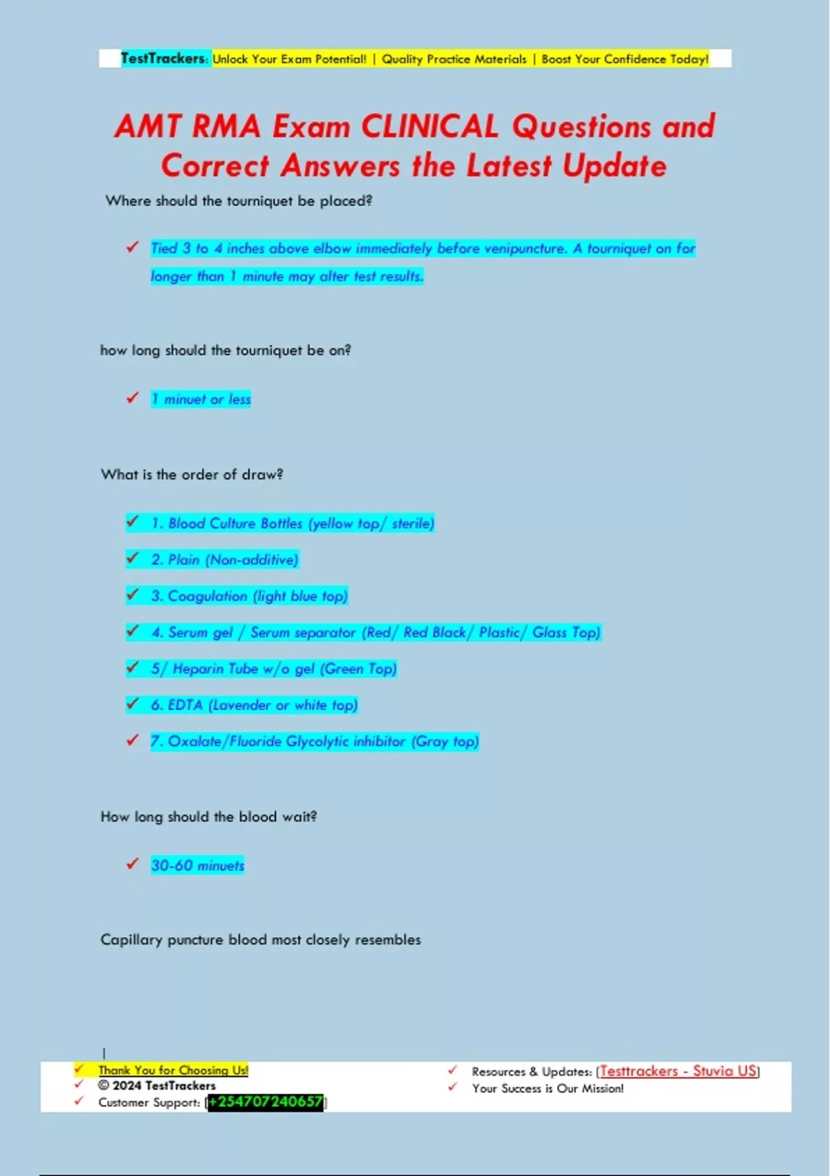 Where should the tourniquet be placed? Tied 3 to 4 inches above elbow immediately before venipuncture. A tourniquet on for longer than 1 minute may alter test results. how long should the tourniquet be on? 1 minuet or less What is the order of draw? 1. Blood Culture Bottles (yellow top/ sterile) 2. Plain (Non-additive) 3. Coagulation (light blue top) 4. Serum gel / Serum separator (Red/ Red Black/ Plastic/ Glass Top) 5/ Heparin Tube w/o gel (Green Top) 6. EDTA (Lavender or white top) 7. Oxalate/Fluoride Glycolytic inhibitor (Gray top) How long should the blood wait? 30-60 minuets Capillary puncture blood most closely resembles TestTrackers: Unlock Your Exam Potential! | Quality Practice Materials | Boost Your Confidence Today! | Thank You for Choosing Us! © 2024 TestTrackers Customer Support: [] Resources & Updates: [Testtrackers - Stuvia US] Your Success is Our Mission! Puncture with lancet to collect a small sample on the finger tips on the 3rd-4th finger or heel of infant Microhematocrit measures CBC (complete blood count) a set of tests that include all WBC, RBC and platelet measurements. RBC Normal men values 4-6 million/cubic millimeter RBC Normal Women values 4-5 million/cubic millimeter WBC normal count 5-10 thousand/cubic millimeter Normal range of total cholesterol 120-220 mg/dl HDL Cholesterol for men TestTrackers: Unlock Your Exam Potential! | Quality Practice Materials | Boost Your Confidence Today! | Thank You for Choosing Us! © 2024 TestTrackers Customer Support: [] Resources & Updates: [Testtrackers - Stuvia US] Your Success is Our Mission! 6-26 mg/dl HDL Cholesterol for women 30-85 mg/dl LDL Normal range 80-140 mg/dl HCT (hematocrit) men 40-50% HCT - hematocrit, female 37-47% HGB - hemoglobin, male 13.5 - 17 g/dL Hgb (hemoglobin) women 12-16 g/dL HGB (hemoglobin) baby 17-19 g/dL TestTrackers: Unlock Your Exam Potential! | Quality Practice Materials | Boost Your Confidence Today! | Thank You for Choosing Us! © 2024 TestTrackers Customer Support: [] Resources & Updates: [Testtrackers - Stuvia US] Your Success is Our Mission! Glucose Measurement 10 Glucose (fasting) 70-110 mg/dL Glucose (Random) 85-125 mg/dL Diabetes Type