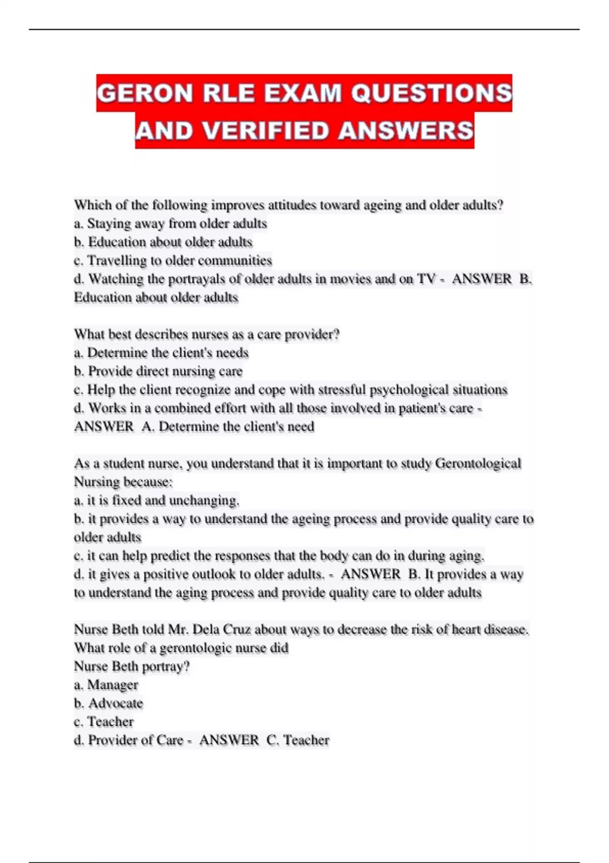 GERON RLE EXAM QUESTIONS AND VERIFIED ANSWERS....