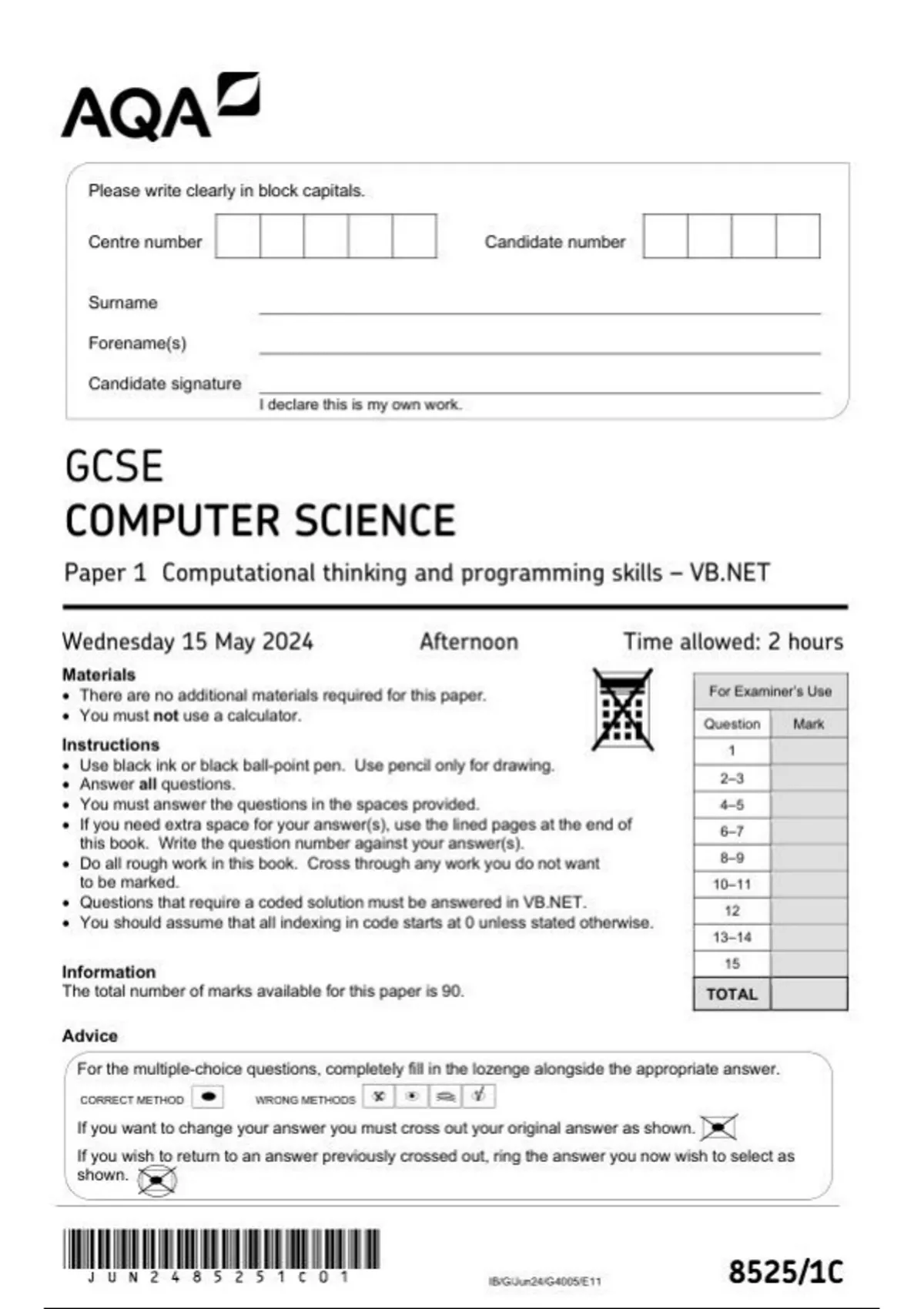 AQA GCSE COMPUTER SCIENCE Paper 1 Computational thinking and programming skills – VB.NET 8525/1c question paper june 2024