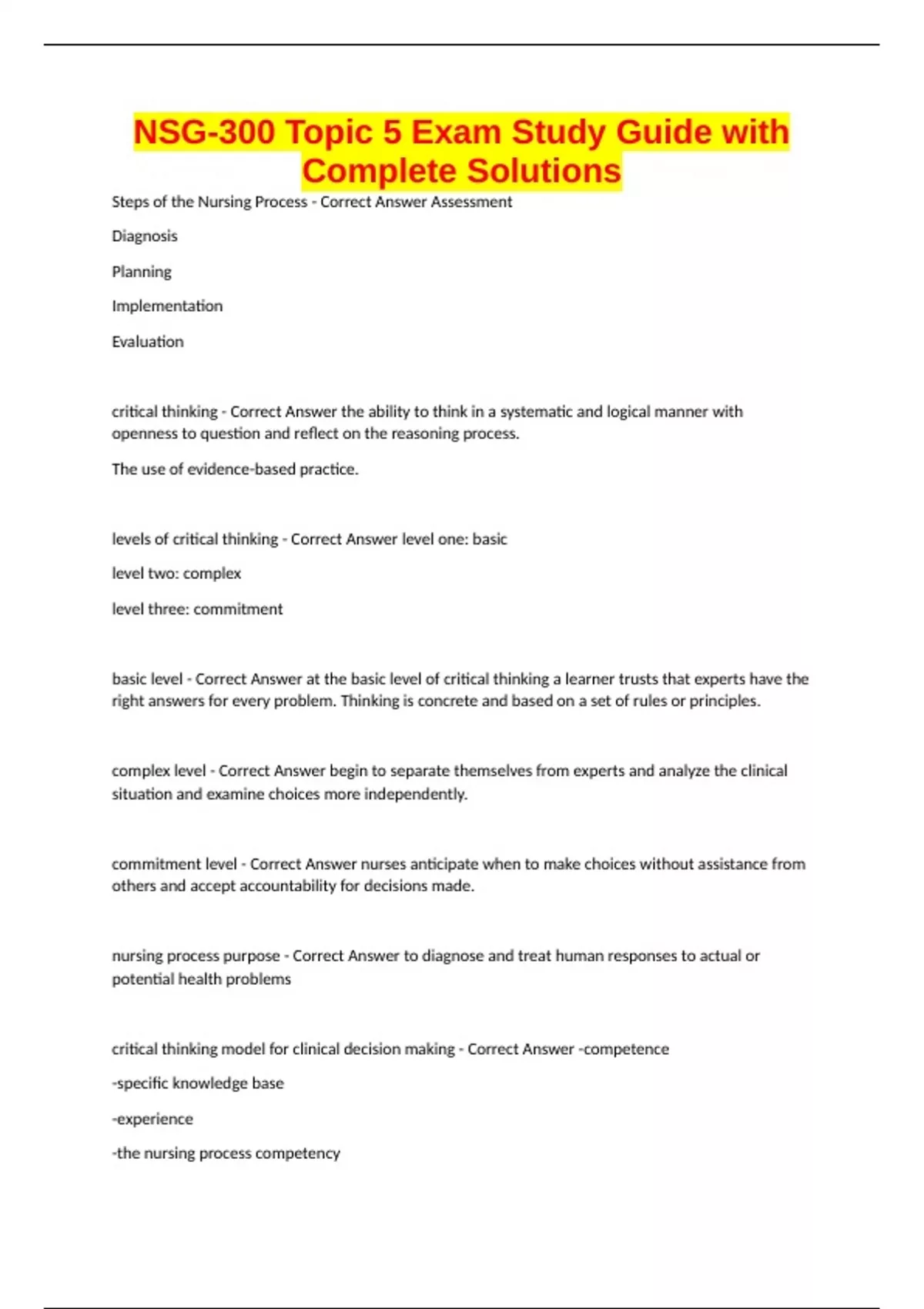 NSG-300 Topic 5 Exam Study Guide with Complete Solutions Steps of the Nursing Process - Correct Answer Assessment Diagnosis Planning Implementation Evaluation critical thinking - Correct Answer the ability to think in a systematic and logical manner with openness to question and reflect on the reasoning process. The use of evidence-based practice. levels of critical thinking - Correct Answer level one: basic level two: complex level three: commitment basic level - Correct Answer at the basic level of critical thinking a learner trusts that experts have the right answers for every problem. Thinking is concrete and based on a set of rules or principles. complex level - Correct Answer begin to separate themselves from experts and analyze the clinical situation and examine choices more independently. commitment level - Correct Answer nurses anticipate when to make choices without assistance from others and accept accountability for decisions made. nursing process purpose - Correct Answer to diagnose and treat human responses to actual or potential health problems critical thinking model for clinical decision making - Correct Answer -competence -specific knowledge base -experience -the nursing process competency