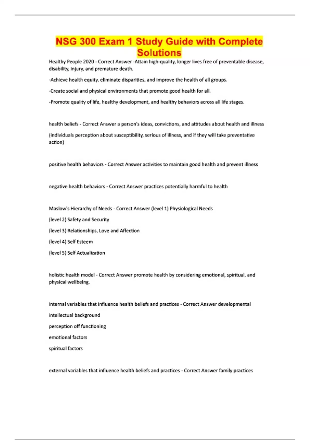 NSG 300 Exam 1 Study Guide with Complete Solutions Healthy People 2020 - Correct Answer -Attain high-quality, longer lives free of preventable disease, disability, injury, and premature death. -Achieve health equity, eliminate disparities, and improve the health of all groups. -Create social and physical environments that promote good health for all. -Promote quality of life, healthy development, and healthy behaviors across all life stages. health beliefs - Correct Answer a person's ideas, convictions, and attitudes about health and illness (individuals perception about susceptibility, serious of illness, and if they will take preventative action) positive health behaviors - Correct Answer activities to maintain good health and prevent illness negative health behaviors - Correct Answer practices potentially harmful to health Maslow's Hierarchy of Needs - Correct Answer (level 1) Physiological Needs (level 2) Safety and Security (level 3) Relationships, Love and Affection (level 4) Self Esteem (level 5) Self Actualization holistic health model - Correct Answer promote health by considering emotional, spiritual, and physical wellbeing. internal variables that influence health beliefs and practices - Correct Answer developmental intellectual background perception off functioning emotional factors spiritual factors external variables that influence health beliefs and practices - Correct Answer family practices socioeconomic