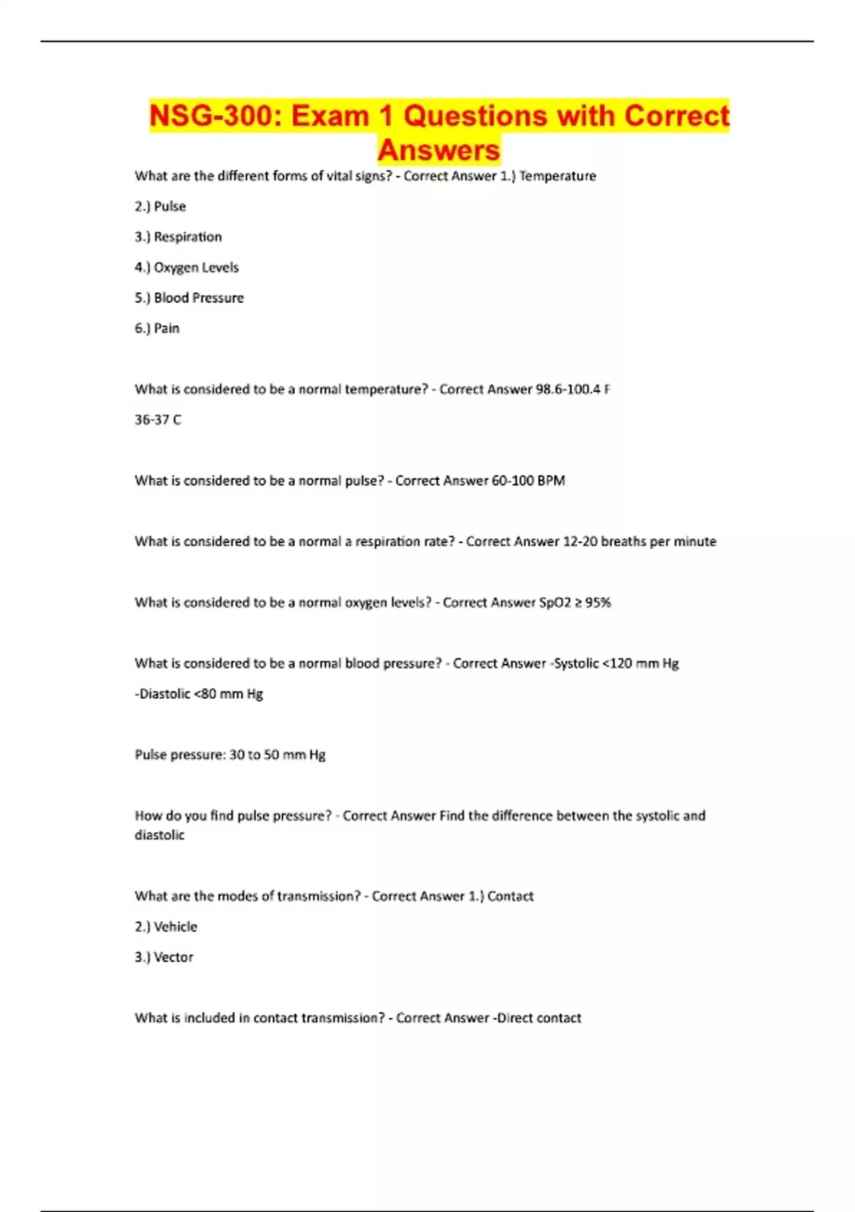 NSG-300: Exam 1 Questions with Correct Answers What are the different forms of vital signs? - Correct Answer 1.) Temperature 2.) Pulse 3.) Respiration 4.) Oxygen Levels 5.) Blood Pressure 6.) Pain What is considered to be a normal temperature? - Correct Answer 98.6-100.4 F 36-37 C What is considered to be a normal pulse? - Correct Answer 60-100 BPM What is considered to be a normal a respiration rate? - Correct Answer 12-20 breaths per minute What is considered to be a normal oxygen levels? - Correct Answer SpO2 ≥ 95% What is considered to be a normal blood pressure? - Correct Answer -Systolic <120 mm Hg -Diastolic <80 mm Hg Pulse pressure: 30 to 50 mm Hg How do you find pulse pressure? - Correct Answer Find the difference between the systolic and diastolic What are the modes of transmission? - Correct Answer 1.) Contact 2.) Vehicle 3.) Vector What is included in contact transmission? - Correct Answer -Direct contact