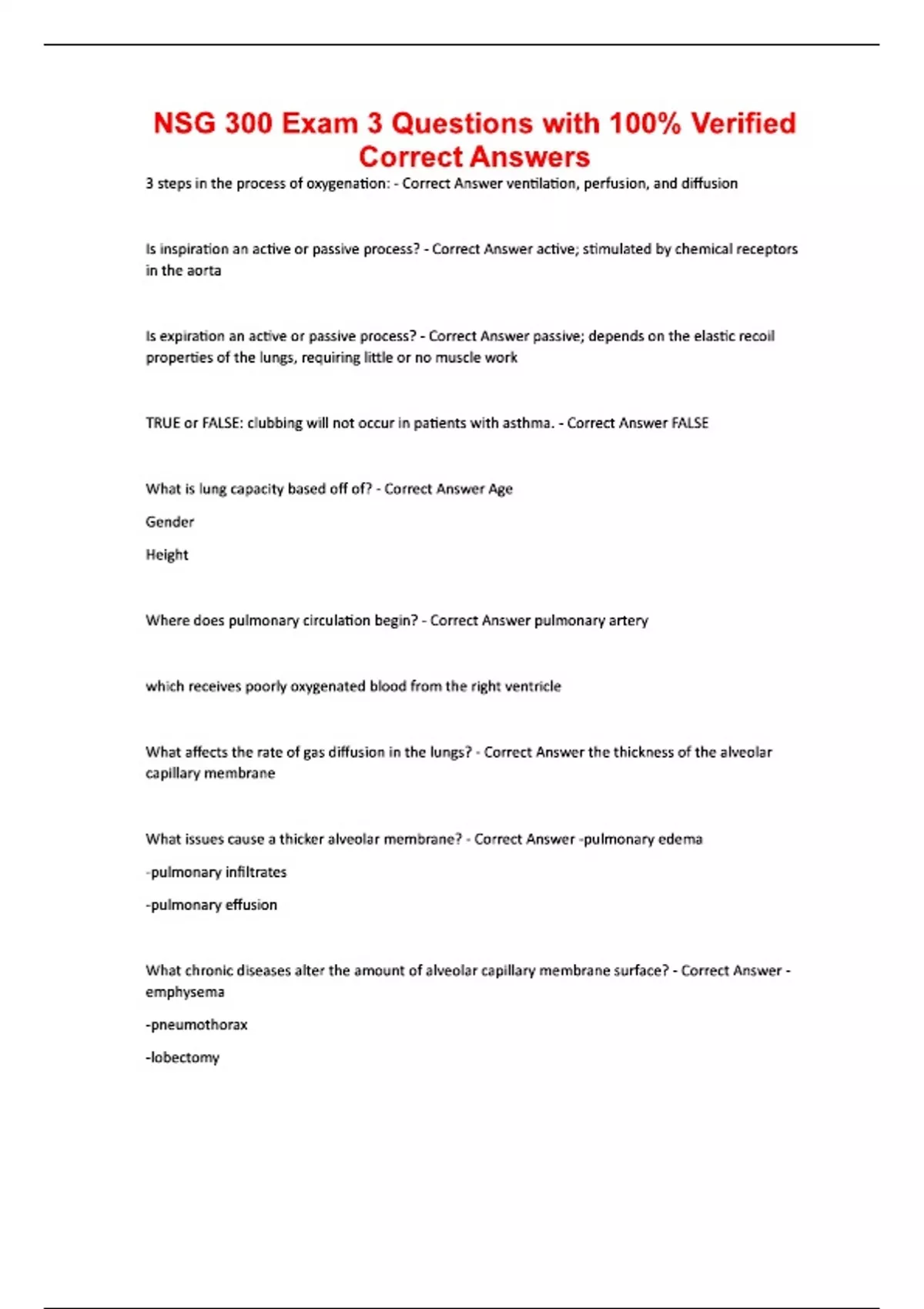 NSG 300 Exam 3 Questions with 100% Verified Correct Answers 3 steps in the process of oxygenation: - Correct Answer ventilation, perfusion, and diffusion Is inspiration an active or passive process? - Correct Answer active; stimulated by chemical receptors in the aorta Is expiration an active or passive process? - Correct Answer passive; depends on the elastic recoil properties of the lungs, requiring little or no muscle work TRUE or FALSE: clubbing will not occur in patients with asthma. - Correct Answer FALSE What is lung capacity based off of? - Correct Answer Age Gender Height Where does pulmonary circulation begin? - Correct Answer pulmonary artery which receives poorly oxygenated blood from the right ventricle What affects the rate of gas diffusion in the lungs? - Correct Answer the thickness of the alveolar capillary membrane What issues cause a thicker alveolar membrane? - Correct Answer -pulmonary edema -pulmonary infiltrates -pulmonary effusion What chronic diseases alter the amount of alveolar capillary membrane surface? - Correct Answer -emphysema -pneumothorax -lobectomy