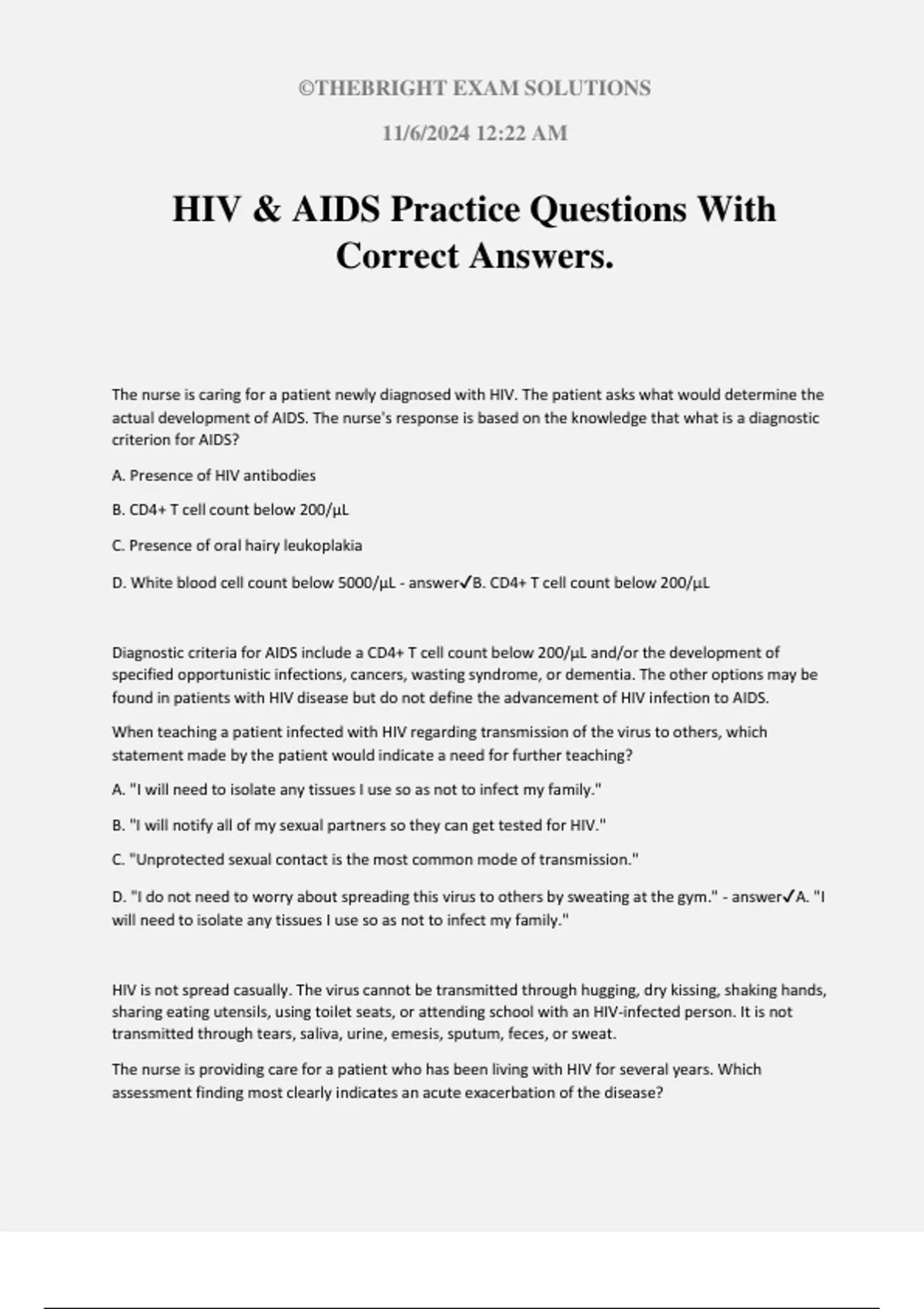 HIV & AIDS Practice Questions With