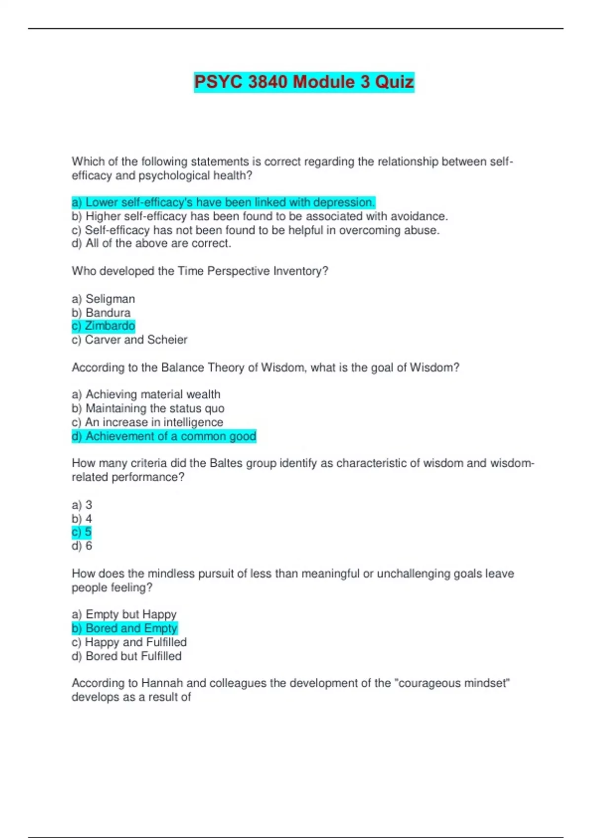 PSYC 3840 Module 3 Quiz | Complete Solutions (Verified) Which of the following statements is correct regarding the relationship between self-efficacy and psychological health? a) Lower self-efficacy's have been linked with depression. b) Higher self-efficacy has been found to be associated with avoidance. c) Self-efficacy has not been found to be helpful in overcoming abuse. d) All of the above are correct. Who developed the Time Perspective Inventory? a) Seligman b) Bandura c) Zimbardo c) Carver and Scheier According to the Balance Theory of Wisdom, what is the goal of Wisdom? a) Achieving material wealth b) Maintaining the status quo c) An increase in intelligence d) Achievement of a common good How many criteria did the Baltes group identify as characteristic of wisdom and wisdom-related performance? a) 3 b) 4 c) 5 d) 6 How does the mindless pursuit of less than meaningful or unchallenging goals leave people feeling? a) Empty but Happy b) Bored and Empty c) Happy and Fulfilled d) Bored but Fulfilled According to Hannah and colleagues the development of the "courageous mindset" develops as a result of a) observing courageous models. b) having high emotional intelligence. c) talking about courage. d) exhibiting courageous behaviors. How did Putnam (1997) define Psychological courage? a) Helping friends and family flourish b) The wisdom to manage life's difficulties c) Strength in facing one's destructive habits d) The ability to cope with the tragedies of life In Bishop's two - component system, current self - regulated attention is to ___________________ as emotional openness is to_________________. a) the acceptance and appreciation of internal experiences; current personal experience. b) internal locus of control; external locus of control. c) problem focused coping; emotion focused coping. d) current personal experience; the acceptance and appreciation of internal experiences. According to Erikson, wisdom is gained through resolving crises associated with a) resolving integrity versus despair. b) contributing to the next generation. c) developing an identity. d) developing autonomy and avoiding guilt. Which of the following is NOT an idea upon which social cognitive theory is built? a) People become skilled at self-regulating by observing themselves in relation to cognitive models. b) Humans have powerful symbolizing capacities. c) All of the above are the building blocks of social cognitive theory. d) People are the result of reciprocal interaction between their thoughts in their environments. When cognitive appraisal of the situation occurs in order to modulate the emotional impact of the stimulus, a) a top - down approach tends to be used by both new users and longer-term users of mindfulness strategies. b) newer users of mindfulness tend to use a top-down approach, while longer-term users tend to use a bottom - up approach. c) a bottom - down approach tends to be used by both new users and longer - term users of mindfulness strategies. d) newer users of mindfulness tend to use a bottom-up approach, while longer-term users tend to use a top-down approach. What temporal perspective is emphasized in the dominant Caucasian cultural groups in Western cultures? a) Past b) Future c) Present d) Contemporary According to harassment and colleagues, self-efficacy and technological pursuits was highest for a) people who were androgynous. b) women. c) people scored higher in masculine gender role traits. d) men. What do Peterson and Seligman assert about spirituality? a) Spirituality is a universal strength of transcendence. b) Spirituality is a cultural fact. c) Spirituality is an important but nonessential part of human life. d) Spirituality is a vital part of American society. With regard to assessing self efficacy, what would Bandura state? a) Self-efficacy is a dispositional trait that is stable across various contexts and domains. b) Self-efficacy should reflect beliefs about using abilities and skills in specific circumstances and domains. c) Self-efficacy is ever evolving and constantly changing; therefore it can not be measured. d) Self-efficacy should be measured in childhood so that appropriate changes in the environment can be made. In an examination of neurological factors and one's ability to be optimistic, it has been found that individuals high in dispositional optimism also appear to have a) stronger melatonin responses when waking up in the morning. b) weaker cortisol response when waking up in the morning. c) weaker HGH levels when waking up in the morning. d) stronger cortisol response when waking up in the morning. Greason and cash well found that higher degrees of mindfulness in counseling psychology trainees predicted higher levels of _________________ in trainees. a) self-regulation and self-efficacy b) self-efficacy and empathy c) congruence and empathy d) self-efficacy and confidence According to Jung, wisdom develops through a) resolving conflicts pertaining to the family unit. b) overcoming inferiority and striving for superiority. c) developing integrity and avoiding despair. d) resolving psychic conflicts between the id, ego, and superego. Which life span theorist believed that Wisdom reflects a maturity in which concerns for the collective good transcend personal interests? a) Piaget b) Jung c) Freud d) Erikson How would a pessimist explain a bad event? a) As external, stable, and specific b) As internal, stable, and global c) As internal, variable, and global d) As external, variable, and specific What is at the core of the concept of self-efficacy? a) A belief that a bad outcome is specific to that domain b) A belief that good things will happen to you c) An ability to see alternate routes to a desired goal d) A belief that you can accomplish what you want In comparing men and women with regard to self-efficacy a) The difference was found for self-efficacy in language arts, but not social sciences. b) Women had higher self-efficacy in math and social science,
