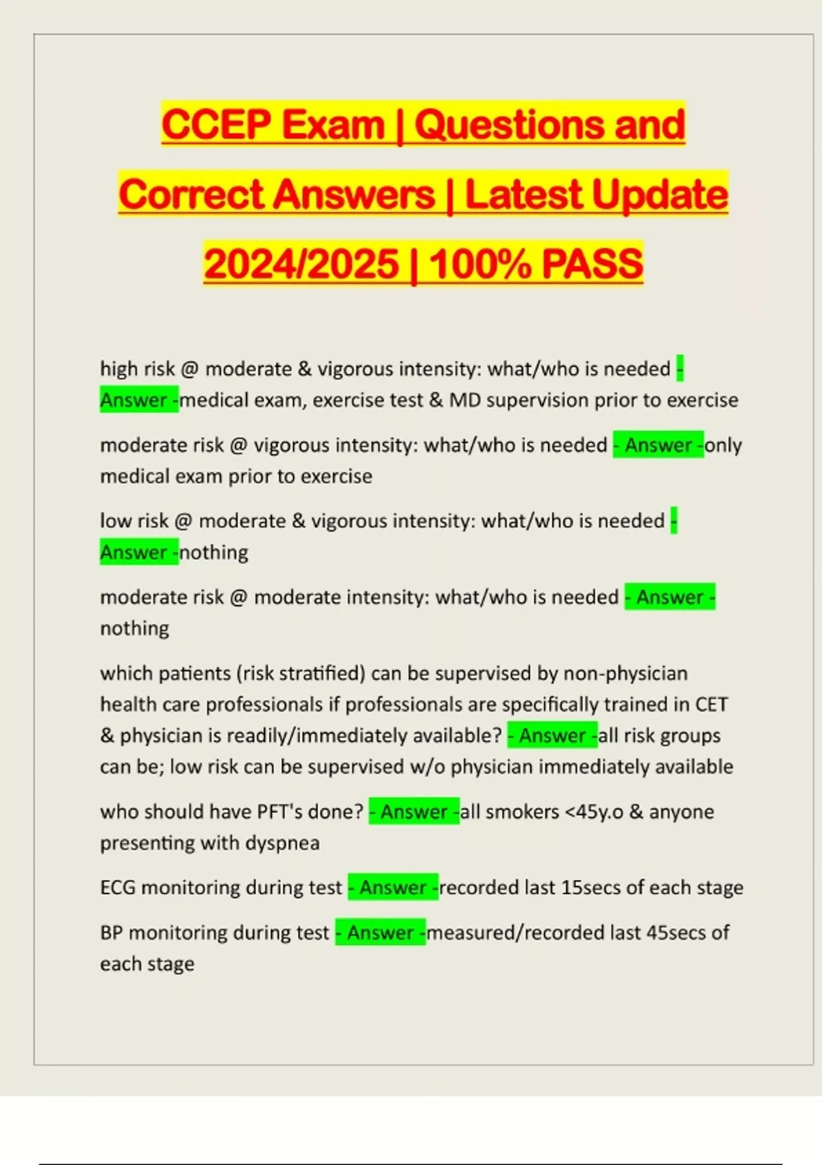CCEP Exam | Questions and Correct Answers | Latest Update 2024/2025 | 100% PASS high risk @ moderate & vigorous intensity: what/who is needed - Answer -medical exam, exercise test & MD supervision prior to exercise moderate risk @ vigorous intensity: what/who is needed - Answer -only medical exam prior to exercise low risk @ moderate & vigorous intensity: what/who is needed - Answer -nothing moderate risk @ moderate intensity: what/who is needed - Answer - nothing which patients (risk stratified) can be supervised by non-physician health care professionals if professionals are specifically trained in CET & physician is readily/immediately available? - Answer -all risk groups can be; low risk can be supervised w/o phy