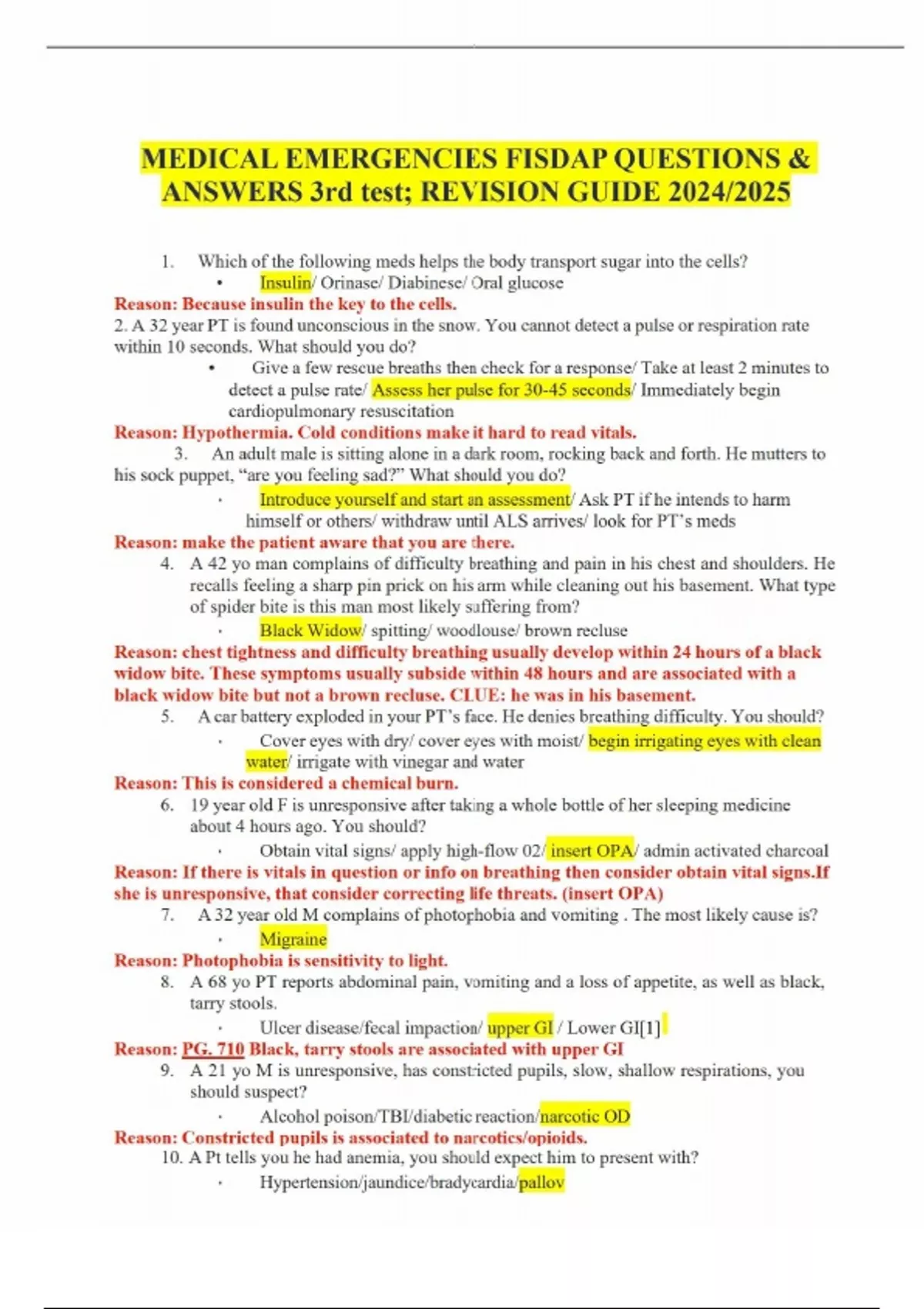 MEDICAL EMERGENCIES FISDAP QUESTIONS & ANSWERS 3rd test; REVISION GUIDE .