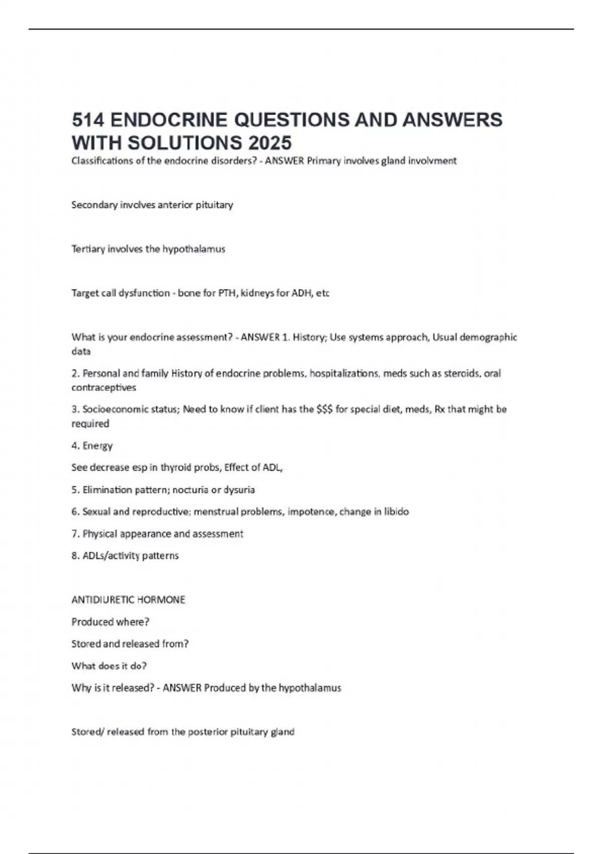 Classifications of the endocrine disorders? - ANSWER Primary involves gland involvment Secondary involves anterior pituitary Tertiary involves the hypothalamus Target call dysfunction - bone for PTH, kidneys for ADH, etc What is your endocrine assessment? - ANSWER 1. History; Use systems approach, Usual demographic data 2. Personal and family History of endocrine problems, hospitalizations, meds such as steroids, oral contraceptives 3. Socioeconomic status; Need to know if client has the $$$ for special diet, meds, Rx that might be required 4. Energy See decrease esp in thyroid probs, Effect of ADL, 5. Elimination pattern; nocturia or dysuria 6. Sexual and reproductive; menstrual problems, impotence, change in libido 7. Physical appearance and assessment 8. ADLs/activity patterns ANTIDIURETIC HORMONE Produced where? Stored and released from? What does it do? Why is it released? - ANSWER Produced by the hypothalamus Stored/ released from the posterior pituitary gland Conserves water to maintain blood pressure Acts on collecting ducts and tubules of kidney Secreted in response to: ----Increased serum osmolarity ----Decreased plasma volume ----Decreased blood pressure What hormone is deficient in DI? Why? Lack of this hormone causes? - ANSWER Decrease in ADH synthesis Inability of kidneys to respond to ADH Increased urine output Specific gravity < 1.005 Serum Na+ > 145 Increased serum osmolarity Decreased urine osmolarity Dehydration. Must keep hydrated Thirst Diagnostic evaluation of DI - ANSWER 1. Measure 24hr fluid I&O w/o restricting food or fluids. +=UO >4L and >ingestion value 2. Water deprivation test 3. Chemistries - serum and urine 4.