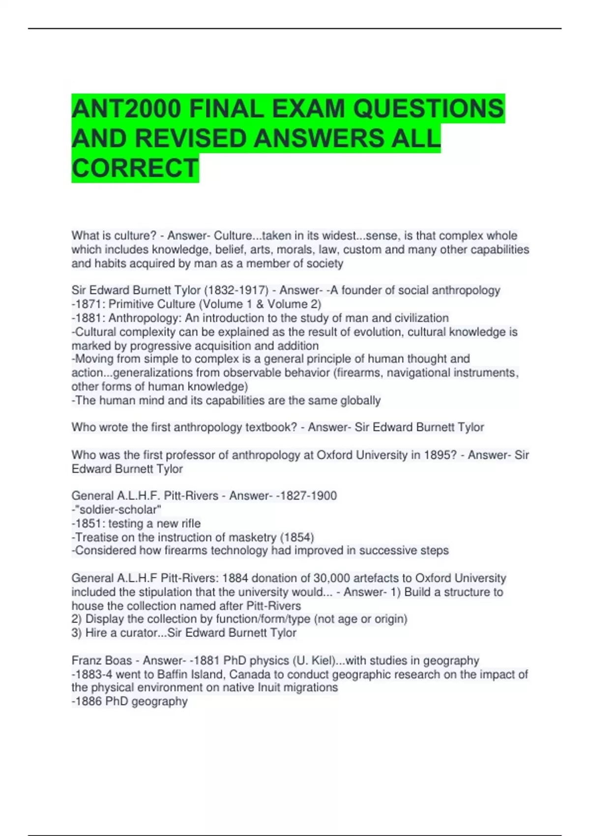 ANT2000 FINAL EXAM QUESTIONS AND REVISED ANSWERS ALL CORRECT What is culture? - Answer- Culture...taken in its widest...sense, is that complex whole which includes knowledge, belief, arts, morals, law, custom and many other capabilities and habits acquired by man as a member of society Sir Edward Burnett Tylor () - Answer- -A founder of social anthropology -1871: Primitive Culture (Volume 1 & Volume 2) -1881: Anthropology: An introduction to the study of man and civilization -Cultural complexity can be explained as the result of evolution, cultural knowledge is marked by progressive acquisition and addition -Moving from simple to complex is a general principle of human thought and action...generalizations from observable behavior (firearms, navigational instruments, other forms of human knowledge) -The human mind and its capabilities are the same globally Who wrote the first anthropology textbook? - Answer- Sir Edward Burnett Tylor Who was the first professor of anthropology at Oxford University in 1895? - Answer- Sir Edward Burnett Tylor General A.L.H.F. Pitt-Rivers - Answer- - -"soldier-scholar" -1851: testing a new rifle -Treatise on the instruction of masketry (1854) -Considered how firearms technology had improved in successive steps General A.L.H.F Pitt-Rivers: 1884 donation of 30,000 artefacts to Oxford University included the stipulation that the university would... - Answer- 1) Build a structure to house the collection named after Pitt-Rivers 2) Display the collection by function/form/type (not age or origin) 3) Hire a curator...Sir Edward Burnett Tylor Franz Boas - Answer- -1881 PhD physics (U. Kiel)...with studies in geography -1883-4 went to Baffin Island, Canada to conduct geographic research on the impact of the physical environment on native Inuit migrations -1886 PhD geography - Chicago World's Fair...set up exhibits of Inuit and Kwakiutl -1896 Curator and Lecture: American Museum Natural History -1899 Professor of Anthropology Colombia Univ. established the first anthropology PhD program in the US.. Who is the "Father of American Anthropology"? - Answer- Franz Boas The "Father of American Anthropology" (Franz Boas) crated the ____-____ organization of American anthropology - Answer- four-field True or False: In their 2000 paper on the evolution of human skin coloration, Jablonski N.G. & Chaplin concluded that the ancestors of modern humans lost the long hair and light skin of their chimpanzee-like ancestors when they developed sweat glands for evaporative cooling. Deep pigmentation protected these later hominins from the folate-destructive effects of solar radiation on "hairless" skin. - Answer- True True or False: In 1871, Sir Edward Burnett Tylor (the person who would become the first professor of anthropology at Oxford University), introduced a definition of "culture": "Culture...taken in its widest...sense, is that complex whole which includes knowledge, belief, arts, morals, law, custom and many other capabilities and habits acquired by man as a member of society." - Answer- True