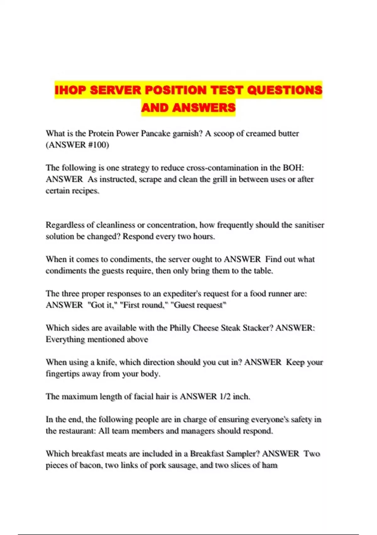 IHOP SERVER POSITION TEST QUESTIONS