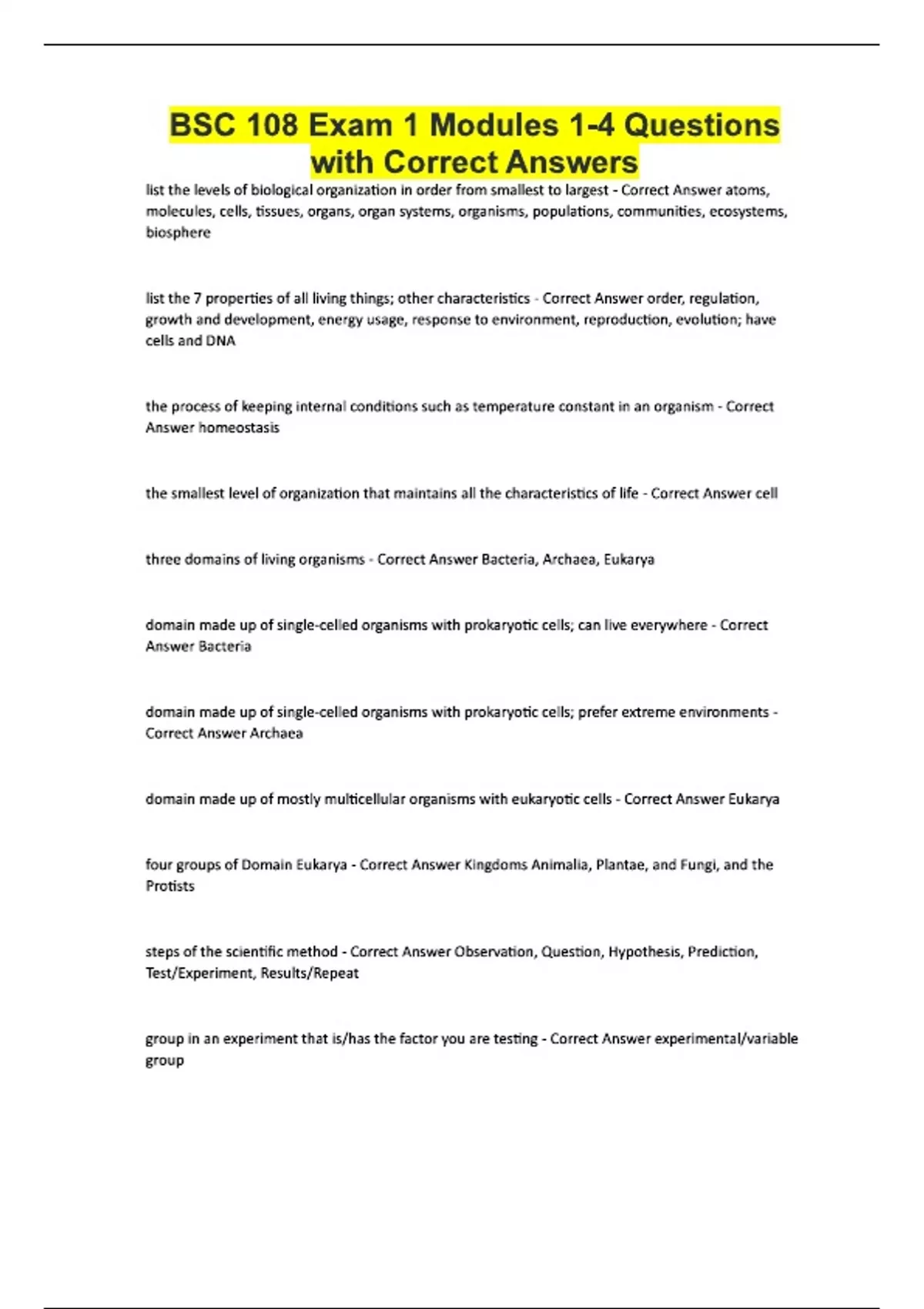 BSC 108 Exam 1 Modules 1-4 Questions with Correct Answers list the levels of biological organization in order from smallest to largest - Correct Answer atoms, molecules, cells, tissues, organs, organ systems, organisms, populations, communities, ecosystems, biosphere list the 7 properties of all living things; other characteristics - Correct Answer order, regulation, growth and development, energy usage, response to environment, reproduction, evolution; have cells and DNA the process of keeping internal conditions such as temperature constant in an organism - Correct Answer homeostasis the smallest level of organization that maintains all the characteristics of life - Correct Answer cell three domains of living organisms - Correct Answer Bacteria, Archaea, Eukarya domain made up of single-celled organisms with prokaryotic cells; can live everywhere - Correct Answer Bacteria domain made up of single-celled organisms with prokaryotic cells; prefer extreme environments - Correct Answer Archaea domain made up of mostly multicellular organisms with eukaryotic cells - Correct Answer Eukarya four groups of Domain Eukarya - Correct Answer Kingdoms Animalia, Plantae, and Fungi, and the Protists steps of the scientific method - Correct Answer Observation, Question, Hypothesis, Prediction, Test/Experiment, Results/Repeat group in an experiment that is/has the factor you are testing - Correct Answer experimental/variable group