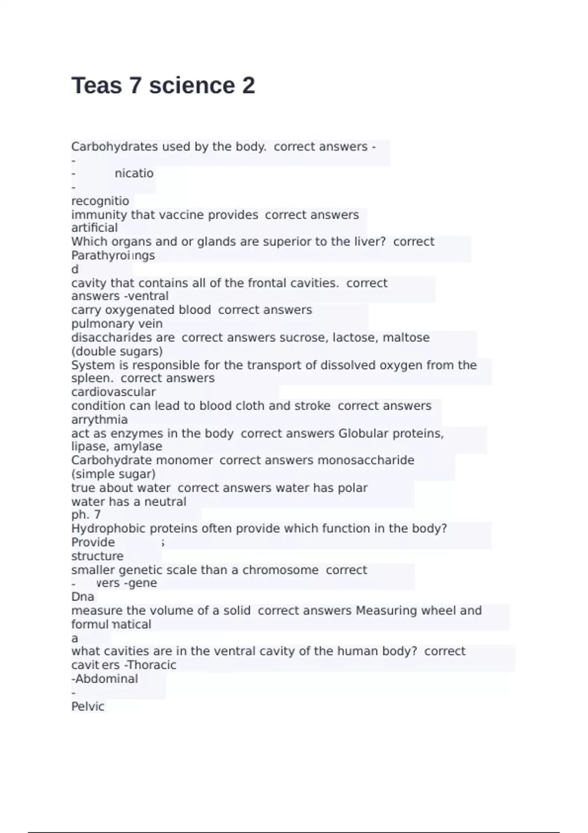 Carbohydrates used by the body. correct answers -structure -communication -storage -recognition immunity that vaccine provides correct answers artificial Which organs and or glands are superior to the liver? correct answers lungs Parathyroid cavity that contains all of the frontal cavities. correct answers -ventral carry oxygenated blood correct answers pulmonary vein disaccharides are correct answers sucrose, lactose, maltose (double sugars) System is responsible for the transport of dissolved oxygen from the lungs to the spleen. correct answers cardiovascular condition can lead to blood cloth and stroke correct answers arrythmia act as enzymes in the body correct answers Globular proteins, lipase, amylase Carbohydrate monomer correct answers monosaccharide (simple sugar) true about water correct answers water has polar covalent bonds water has a neutral ph. 7 Hydrophobic proteins often provide which function in the body? correct answers Provide structure smaller genetic scale than a chromosome correct answers -gene -Dna measure the volume of a solid correct answers Measuring wheel and mathematical formula what cavities are in the ventral cavity of the human body? correct answers -Thoracic cavity -Abdominal cavity -Pelvic