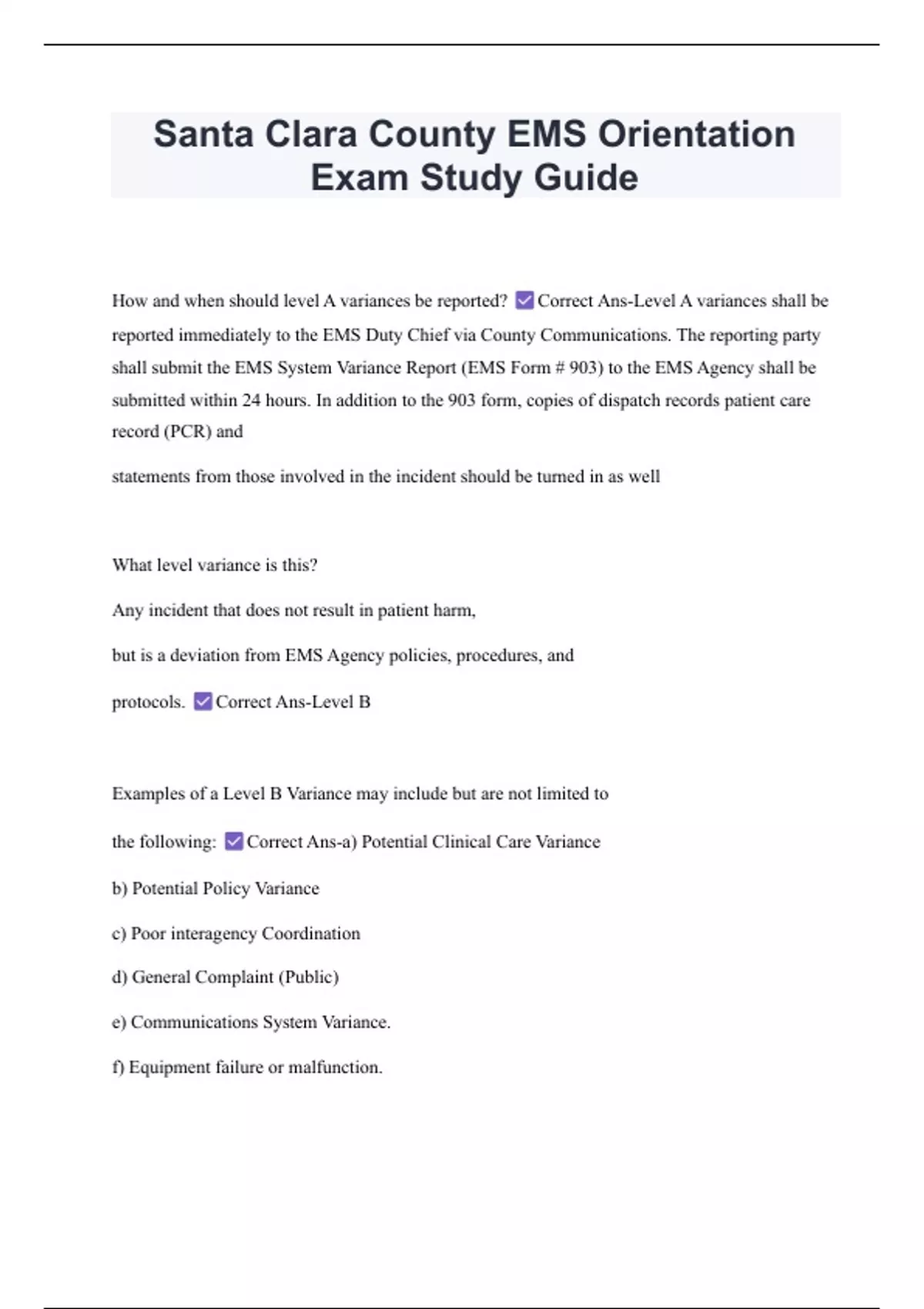 , Level B variances should be reported to? Correct Ans-EMS Agency within five