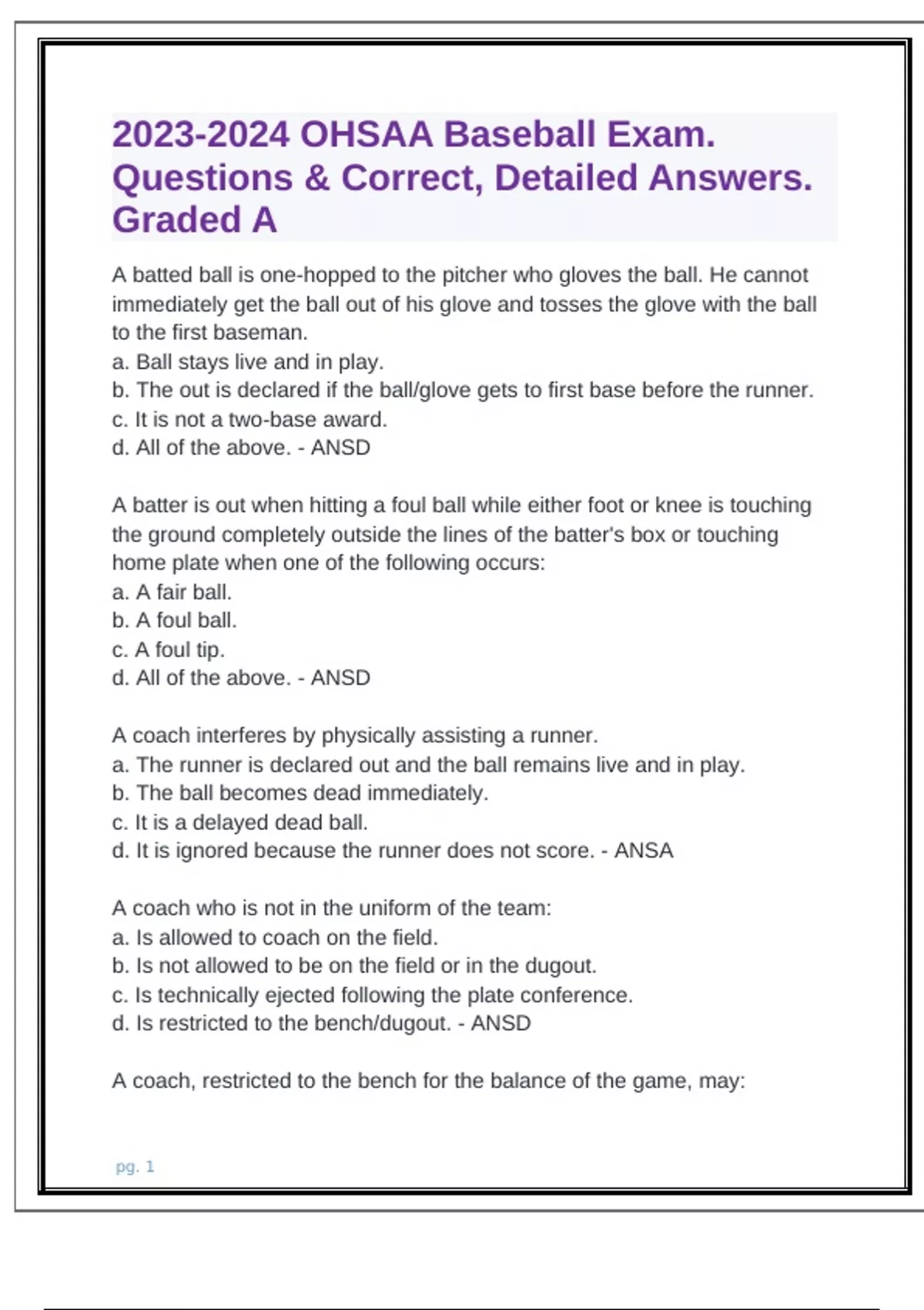 OHSAA Baseball Exam. Questions & Correct, Detailed Answers. Graded A (1).docx