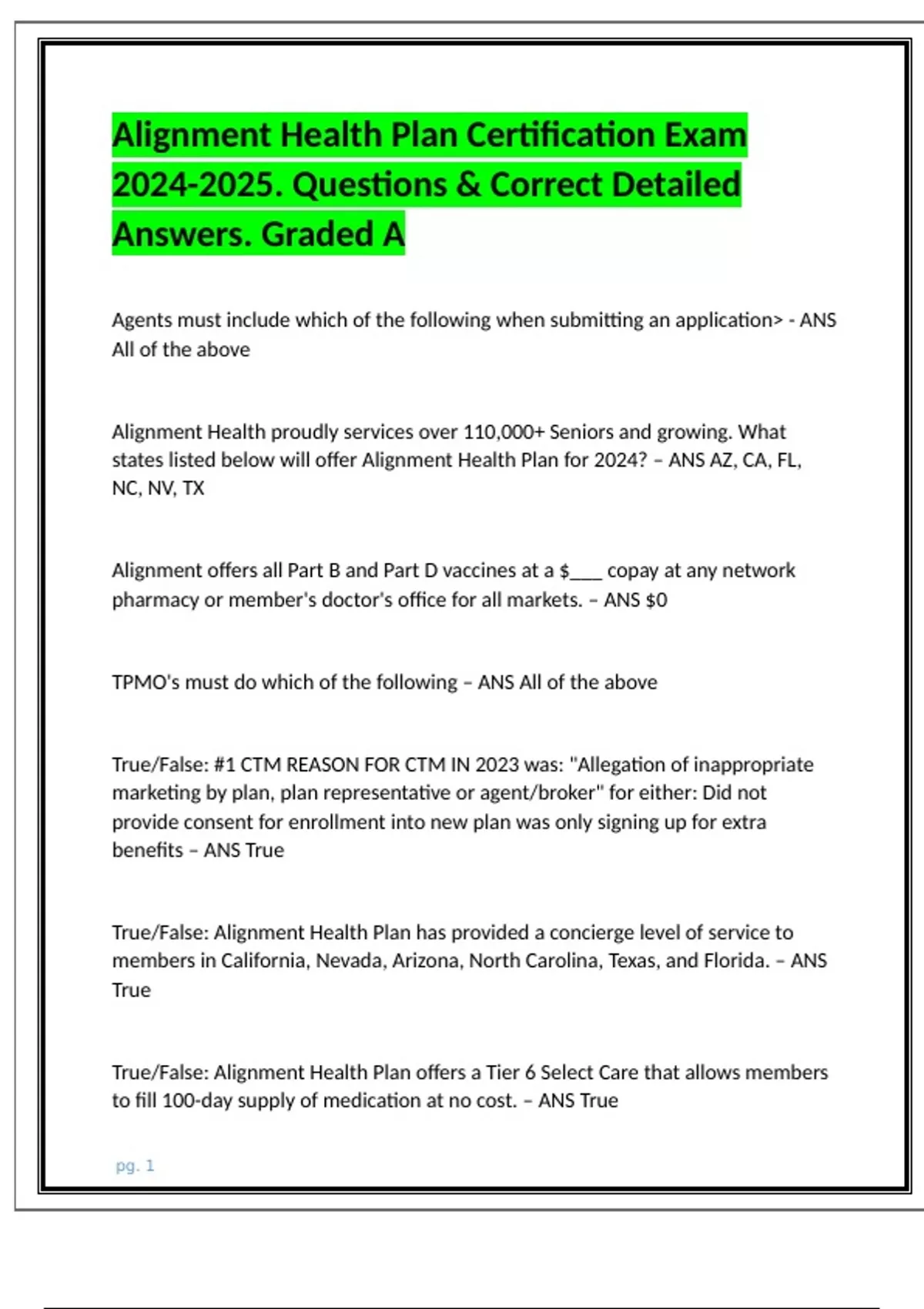 2024 Alignment Health Plan Certification Exam . Questions and Correct Answers. Graded A (1).docx