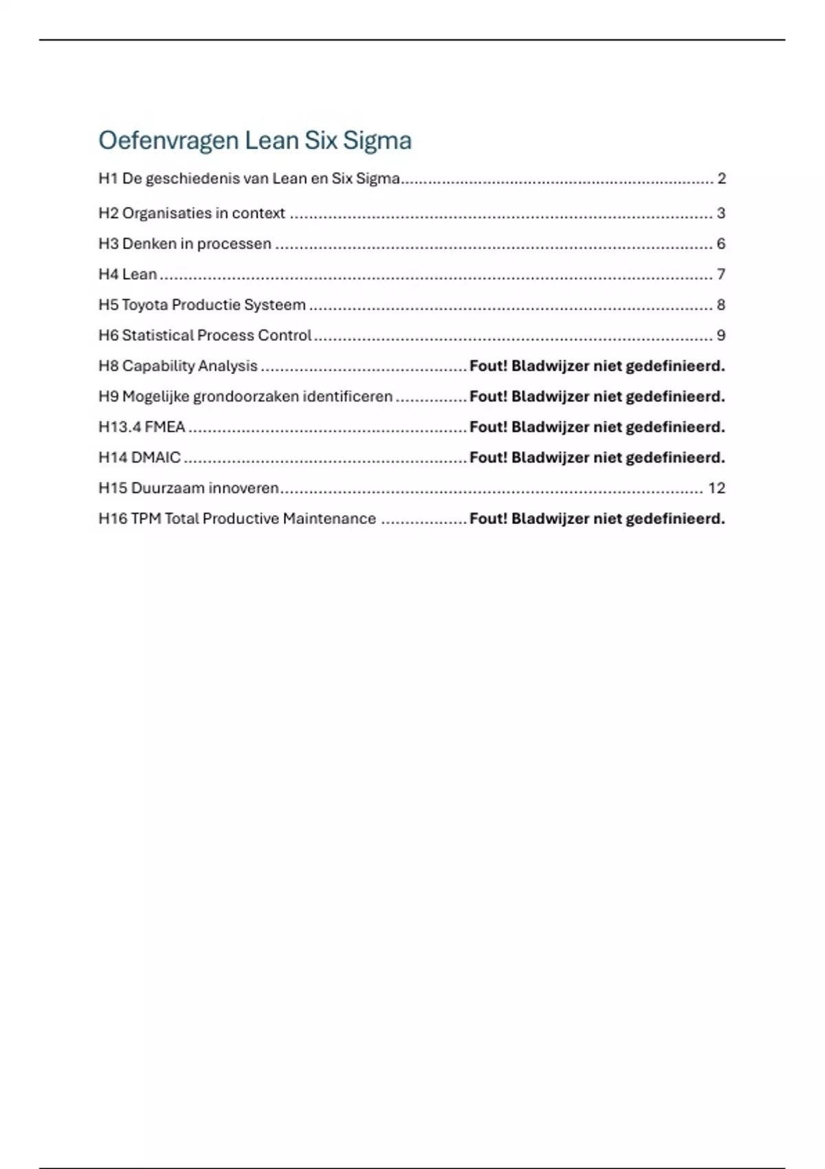 Dit is zijn oefenvragen die gebaseerd zijn op een samenvatting van het boek LEAN SIX SIGMA (2e druk) , dit boek is geschreven door Willem Salentijn. In het boek staat lean en six sigma centraal. Deze oefenvragen bevat de theorie van H1 t/m 9 en 13 t/m 16.