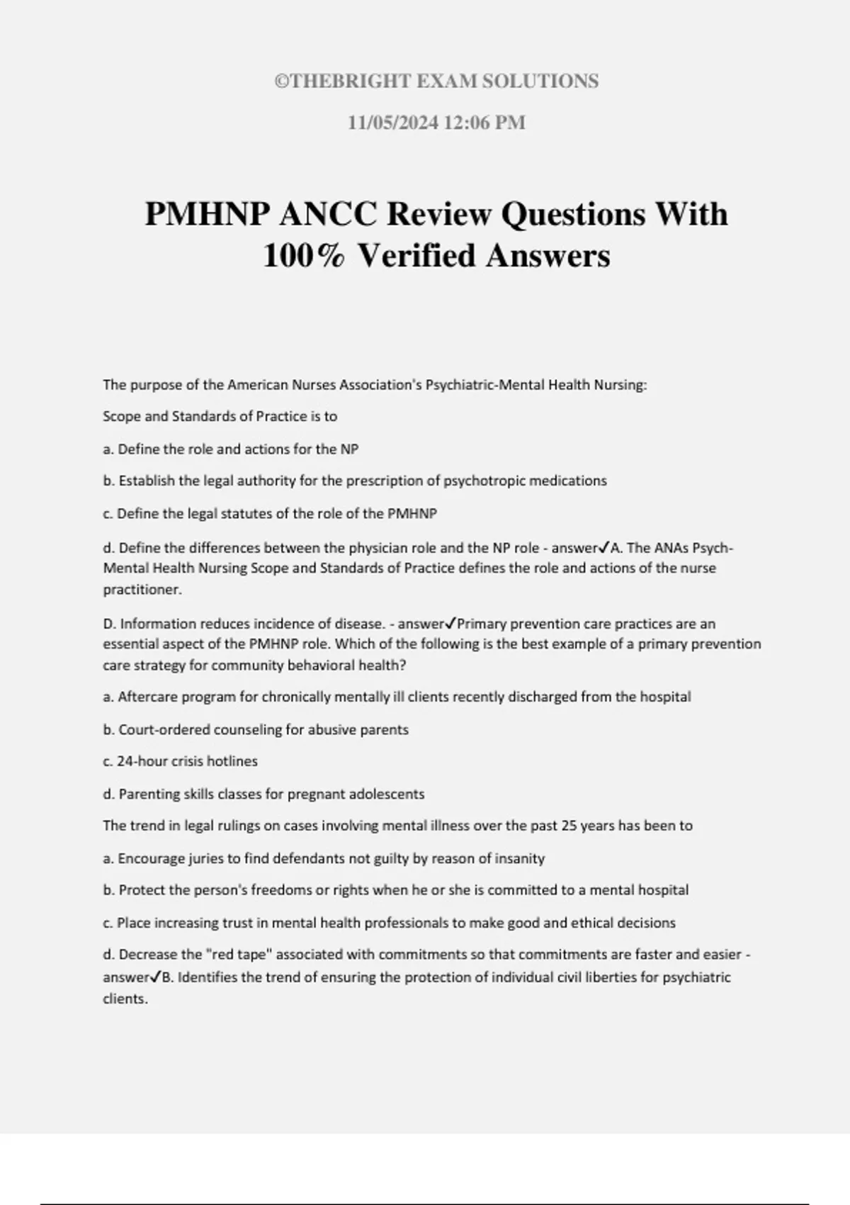 PMHNP ANCC Review Questions With 100% Verified Answers The purpose of the American Nurses Association's Psychiatric-Mental Health Nursing: Scope and Standards of Practice is to a. Define the role and actions for the NP b. Establish the legal authority for the prescription of psychotropic medications c. Define the legal statutes of the role of the PMHNP d. Define the differences between the physician role and the NP role - answerA. The ANAs Psych- Mental Health Nursing Scope and Standards of Practice defines the role and actions of the nurse practitioner. D. Information reduces incidence of disease. - answerPrimary prevention care practices are an essential aspect of the PMHNP role. Which of the following is the best example of a primary prevention care strategy for community behavioral health? a. Aftercare program for chronically mentally ill clients recently discharged from the hospital b. Court-ordered counseling for abusive parents c. 24-hour crisis hotlines d. Parenting skills classes for pregnant adolescents The trend in legal rulings on cases involving mental illness over the past 25 years has been to a. Encourage juries to find defendants not guilty by reason of insanity b. Protect the person's freedoms or rights when he or she is committed to a mental hospital c. Place increasing trust in mental health professionals to make good and ethical decisions d. Decrease the "red tape" associated with commitments so that commitments are faster and easier - answerB. Identifies the trend of ensuring the protection of individual civil liberties for psychiatric clients. ©THEBRIGHT EXAM SOLUTIONS 11/05/2024 12:06 PM Mr. Smithers, an involuntarily hospitalized patient experiencing psychotic symptoms, refuses to take any of his ordered medication because he believes "Jesus Christ told me I am the prophet and must fast for a year." Your actions should be based on your knowledge of which of the following? a. Psychiatric clients cannot refuse treatment b. Psychiatric clients do not always know what is good for them c. Psychiatric clients can refuse treatment d. Psychiatric clients cannot be trusted to make good healthcare decisions and, therefore, the nurse's best clinical judgment should guide actions - answerC. As with any client, psychiatric clients can refuse treatment unless a legal process resulting in involuntary commitment or mandatory court order for treatment has been obtained. Which of the following statements best reflects the difference between the nurse-client (N-C) relationship and a social relationship? a. In the N-C relationship, the primary focus is on the client and the client's needs. b. Goals in the N-C relationship are deliberately left vague and unspoken so that the client can work on any issue. c. In the N-C relationship, the nurse is solely responsible for making the relationship work. d. In the N-C relationship, there is no place for social interaction. - answerA. Social relationships are mutual interpersonal relationships in which the needs of both parties are addressed. The N-C relationship is most concerned with meeting the needs of the client. A community has an unusually high incidence of depression and drug use among the teenage population. The public health nurses decide to address this problem, in part, by modifying the environment and strengthening the capacities of families to prevent the development of new cases of depression and drug use. What is this is an example of? a. Primary prevention b. Secondary prevention c. Tertiary prevention d. Protective factorial prevention - answerA. This action focuses on interventions designed to reduce the incidence of new cases of disease. Mrs. Kemp is voluntarily admitted to the hospital. After 24 hours, she states she wishes to leave because "this place can't help me." The best nursing action that reflects the legal right of this client is a. Discharge the client b. Explain that the client cannot leave until you can complete further assessment ©THEBRIGHT EXAM SOLUTIONS 11/05/2024 12:06 PM c. Allow the client to leave but have her sign forms stating she is leaving against medical advice d. Immediately start the paperwork to commit the client and to allow you to treat her against her wishes - answerB. Almost every state allows for a brief for a period detainment to assess a client for dangerousness to self or others before allowing the client to leave a hospital setting, even if the admission was voluntary. In forming a therapeutic relationship with clients, the PMHNP must consider developing many characteristics that are known to be helpful in relationship-building. Which of the following is an essential part of building a therapeutic relationship? a. Collecting a family history b. Like-mindedness c. Authenticity d. Accuracy in assessment - answerC. Authenticity. Being genuine, honest, and respectful are essential elements in establishing a working relationship with any client. Like-mindedness is not a part of the therapeutic relationship. Although an important aspect of the PMHNP role, collecting a family history and accuracy in assessment does not in and of itself facilitate relationship building. According to the DSM-5, which of the following is true? (Ch. 3) a. A mental disorder is equivalent to the need for treatment. b. Diagnostic criteria are used to inform clinical judgment. c. Socially deviant behavior is considered a mental disorder. d. A culturally expected response to a stressor is not a mental disorder. - answerD. All DSM-5 disorders need to be made taking a person's culture into account. A cultural expression of a response to grief, loss, or stress is not considered a DSM-5 diagnosis. Mrs. French has been in individual therapy for 3 months. She has shown much growth and improvement in her functioning and insight and is to discontinue services within the next few weeks. In the next session, after you discuss service termination, she suddenly begins to demonstrate the original symptoms that had brought her to t
