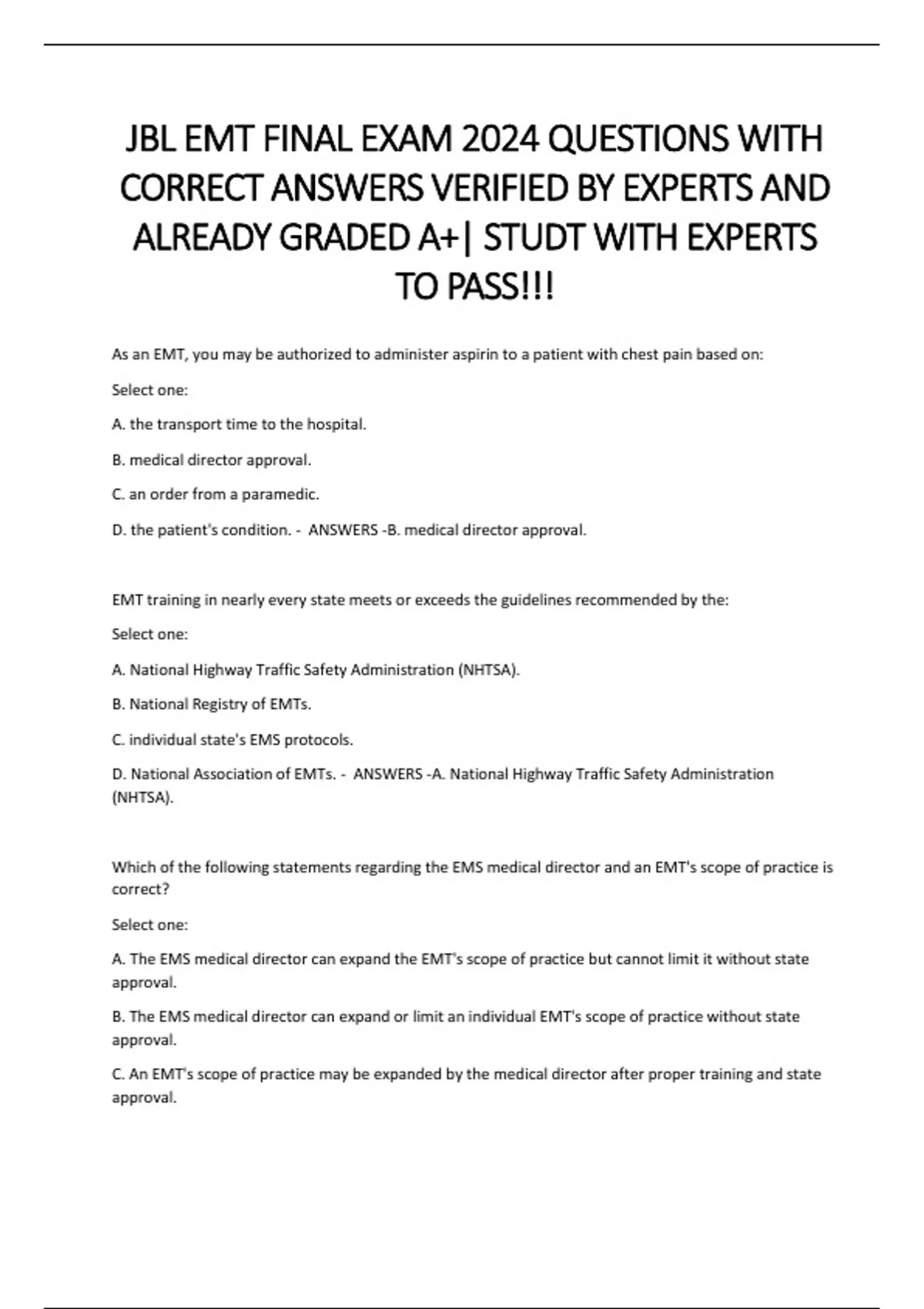 JBL EMT FINAL EXAM 2024 QUESTIONS WITH CORRECT ANSWERS VERIFIED BY EXPERTS AND ALREADY GRADED A+| STUDT WITH EXPERTS TO PASS!!!