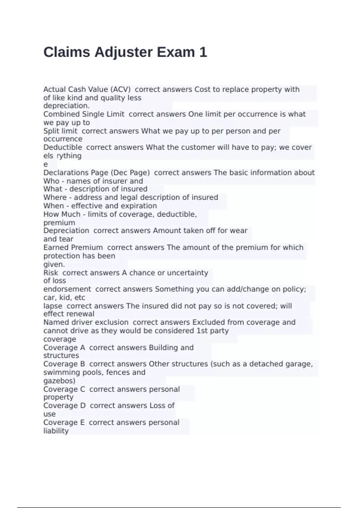 Actual Cash Value (ACV) correct answers Cost to replace property with new property of like kind and quality less depreciation. Combined Single Limit correct answers One limit per occurrence is what we pay up to Split limit correct answers What we pay up to per person and per occurrence Deductible correct answers What the customer will have to pay; we cover everything else Declarations Page (Dec Page) correct answers The basic information about a policy: Who - names of insurer and insured What - description of insured property Where - address and legal description of insured property When - effective and expiration dates. How Much - limits of coverage, deductible, premium Depreciation correct answers Amount taken off for wear and tear Earned Premium correct answers The amount of the premium for which the policy protection has been given. Risk correct answers A chance or uncertainty of loss endorsement correct answers Something you can add/change on policy; car, kid, etc lapse correct answers The insured did not pay so is not covered; will effect renewal Named driver exclusion correct answers Excluded from coverage and covered cars; cannot drive as they would be considered 1st party coverage Coverage A correct answers Building and structures Coverage B correct answers Other structures (such as a detached garage, workshop, swimming pools, fences and gazebos) Coverage C correct answers personal property Coverage D correct answers Loss of use Coverage E correct answers personal