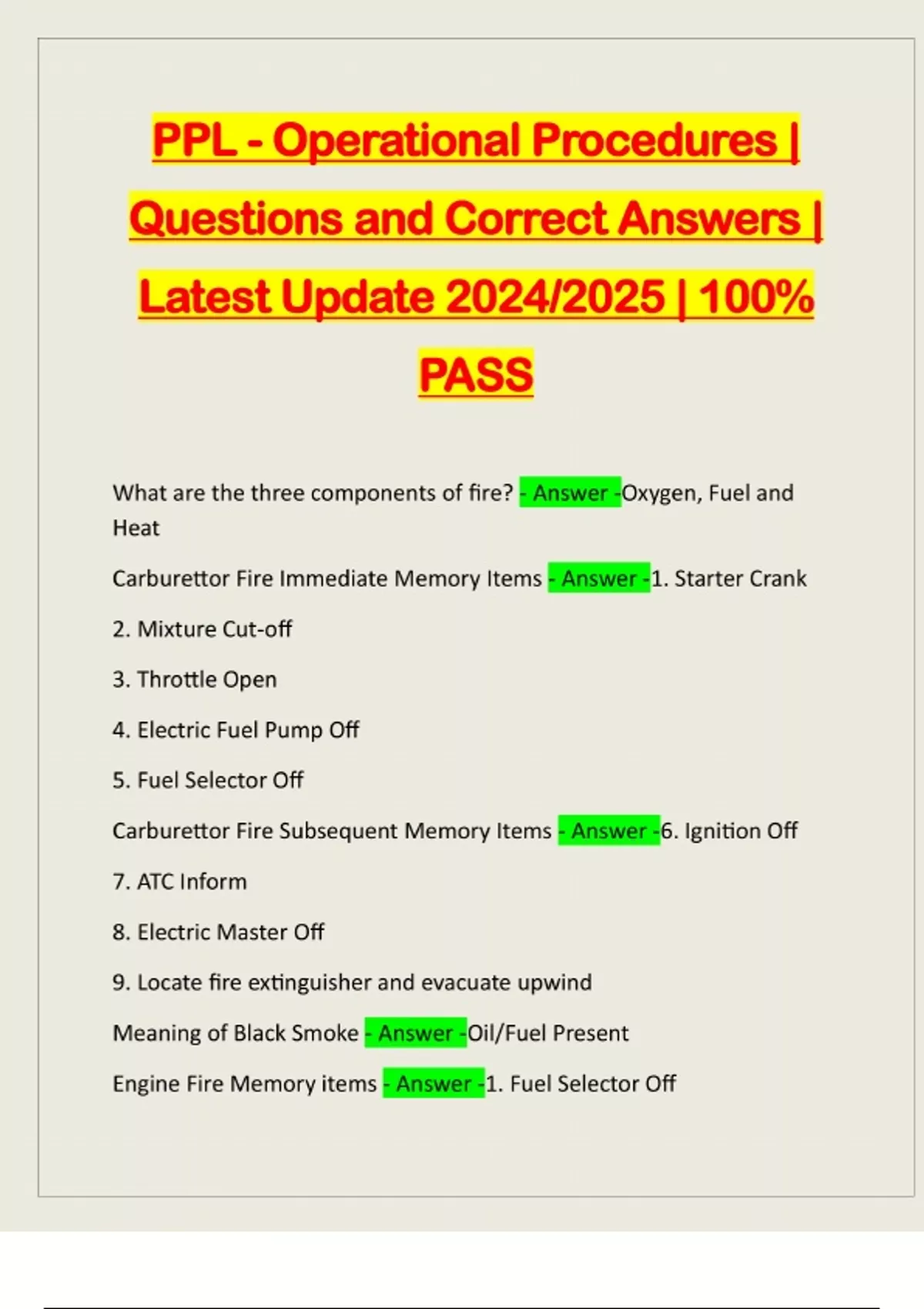 PPL - Operational Procedures | Questions and Correct Answers | Latest Update 2024/2025 | 100% PASS What are the three components of fire? - Answer -Oxygen, Fuel and Heat Carburettor Fire Immediate Memory Items - Answer -1. Starter Crank 2. Mixture Cut-off 3. Throttle Open 4. Electric Fuel Pump Off 5. Fuel Selector Off Carburettor Fire Subsequent Memory Items - Answer -6. Ignition Off 7. ATC Inform 8. Electric Master Off 9. Locate fire extinguisher and evacuate upwind Meaning of Black Smoke - Answer -Oil/Fuel Present Engine Fire Memory items - Answer -1. Fuel Selector Off2. Throttle Closed